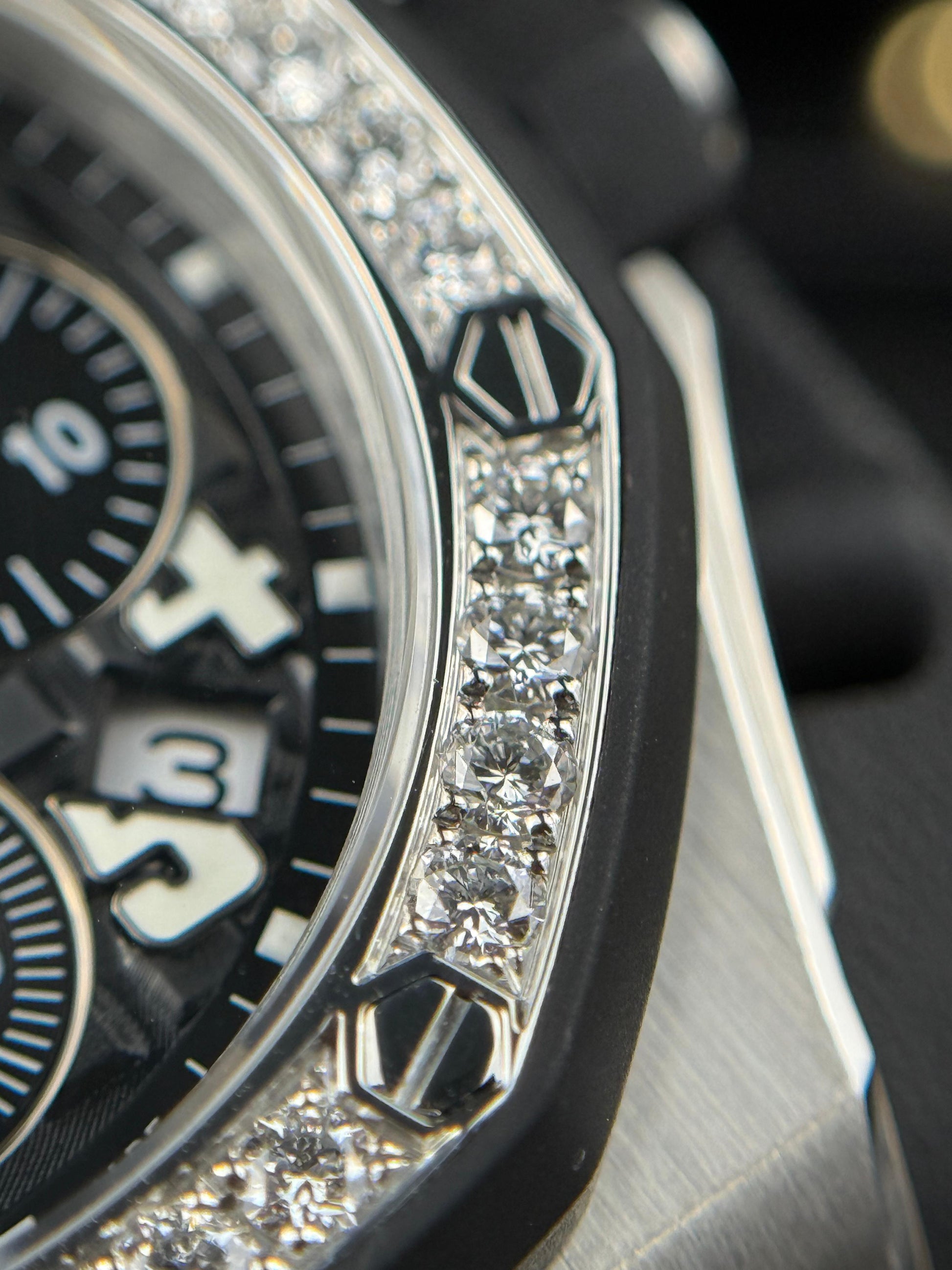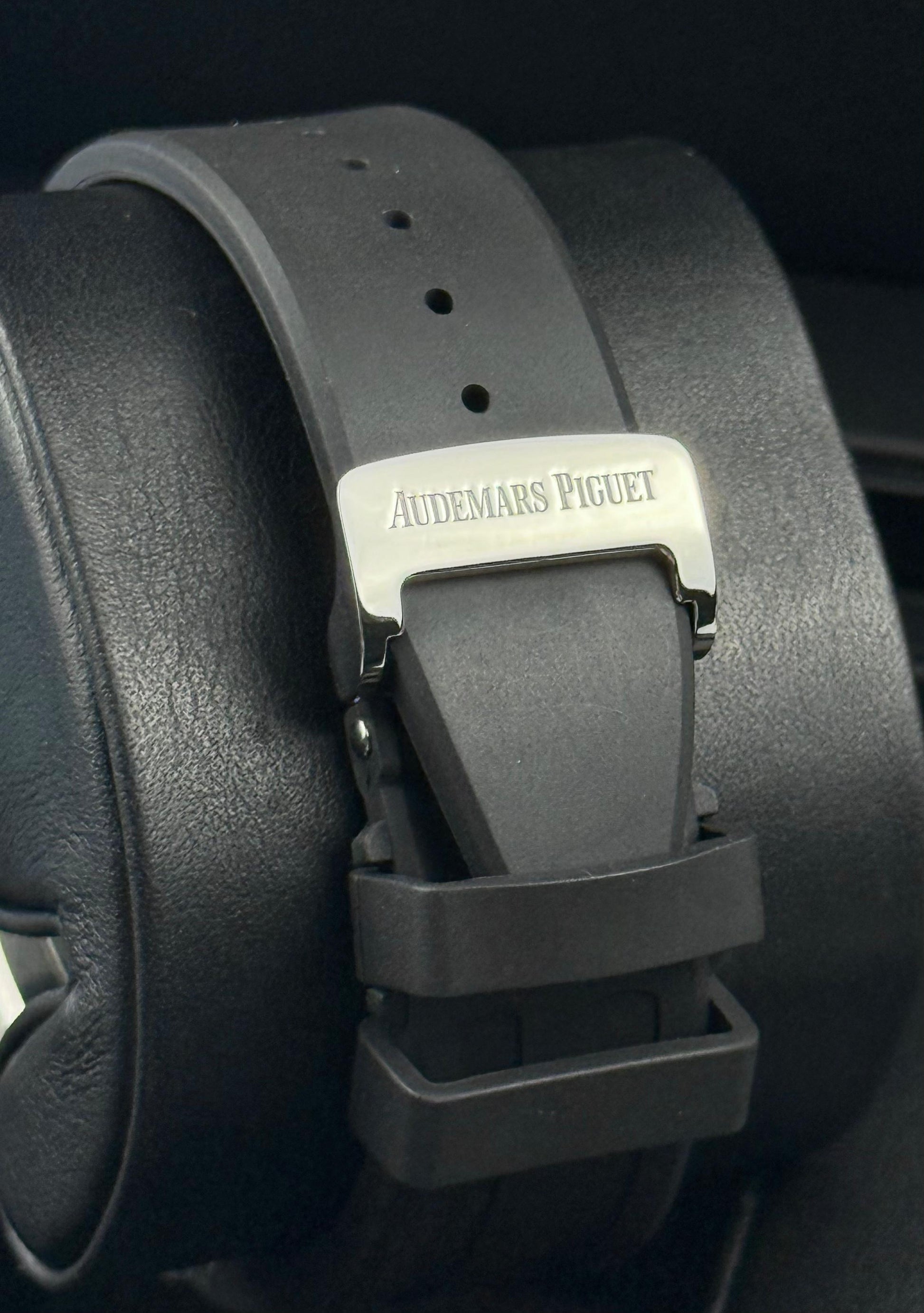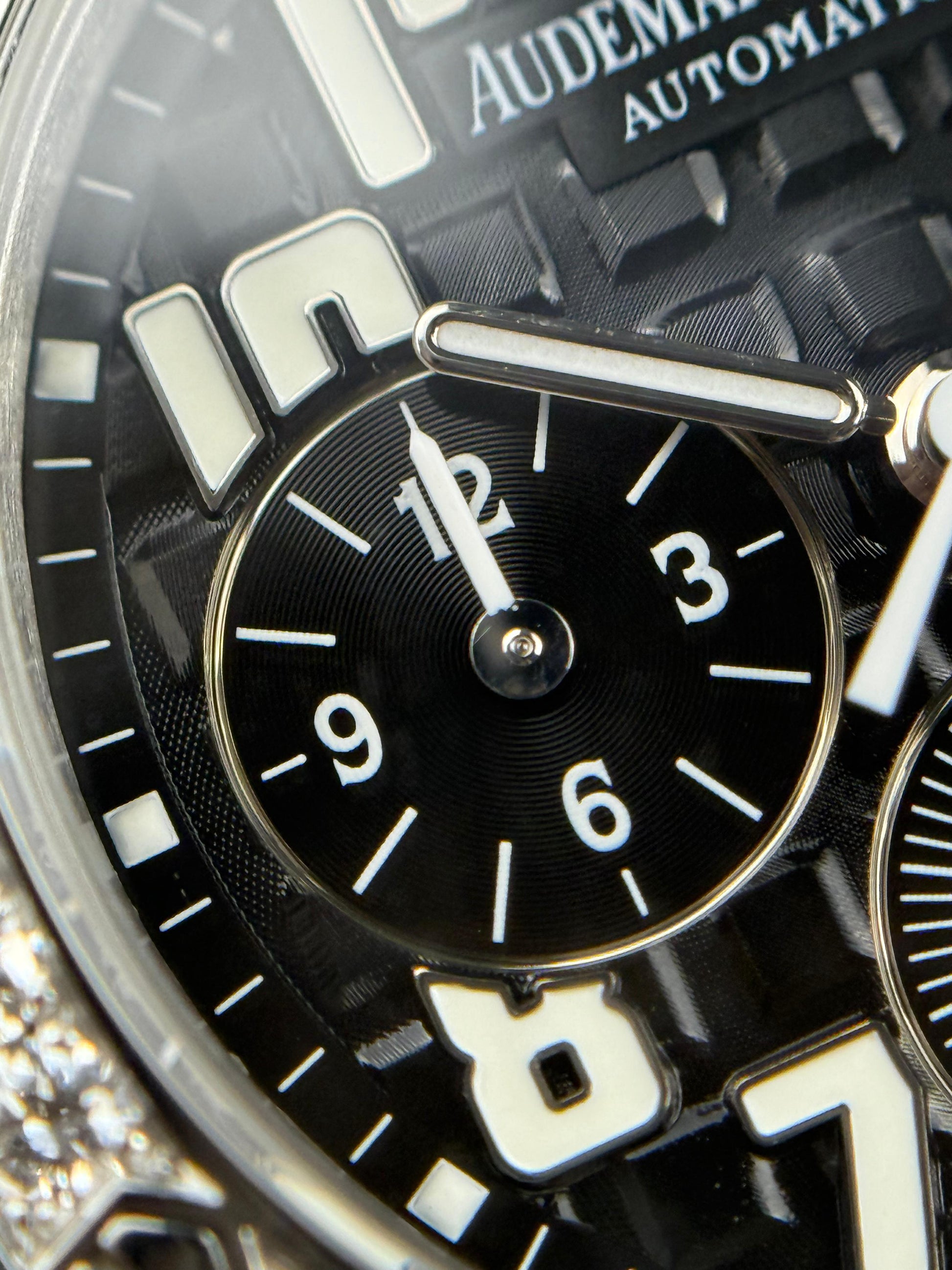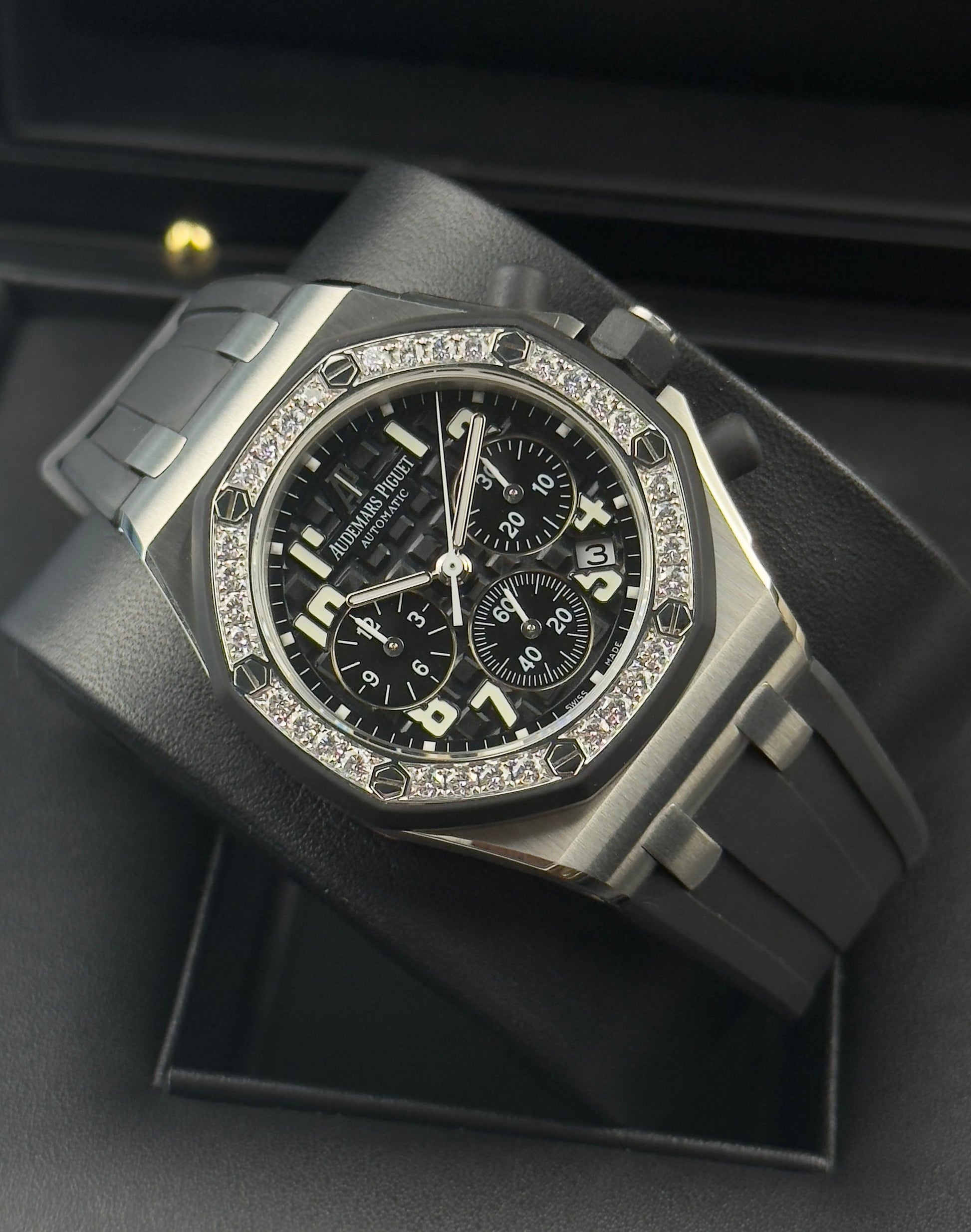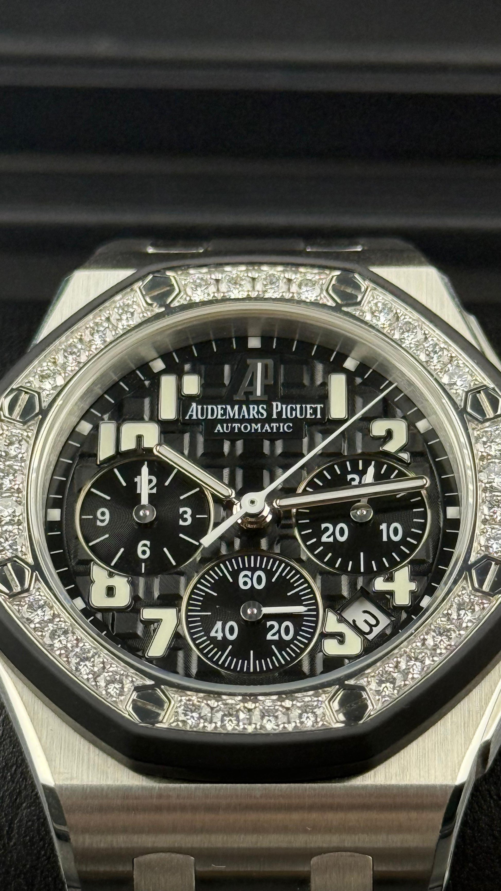 Audemars Piguet Royal Oak Offshore 26048SK.ZZ.D002CA.01 Ladies Watch. 37mm stainless steel case. Black rubber octagon shaped bezel with factory diamond. Black Mega Tapisserie dial with silver-tone hands and Arabic numeral hour markers. Sub-dials: small second, 30 minute counter and 12 hour counter. Date display between 4 & 5 o'clock position. Black rubber strap with stainless steel buckle. Will fit up to a 6.5-inch wrist. Sapphire crystal. Stainless steel case back. Automatic self-winding movement.