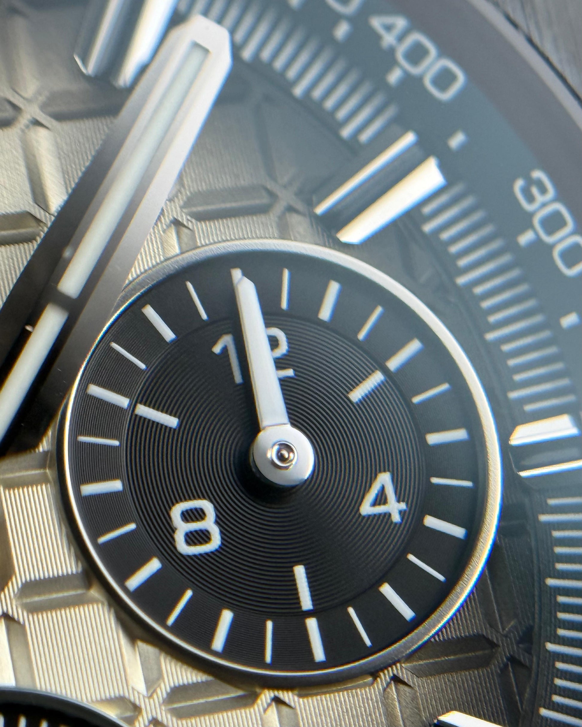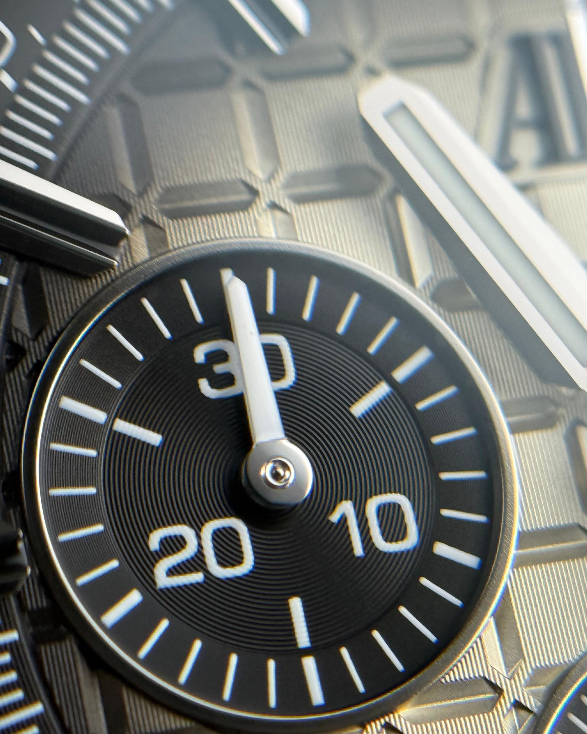 Audemars Piguet Royal Oak Offshore 26420SO.OO.A600CA.01 Mens Watch. 43mm stainless steel case. black ceramic octagon shaped bezel. smoked taupe “Méga Tapisserie” dial with white gold hands and index hour markers. Date display between 4 and 5 o'clock position. Three sub-dials. Small seconds hand at 6 o'clock. 30-minute counter at 9 o'clock. 12-hour counter at 3 o'clock. Light brown rubber strap with stainless steel buckle. Will fit up to a 7.5-inch wrist. Sapphire crystal. Transparent sapphire crystal case back. Automatic self-winding movement.