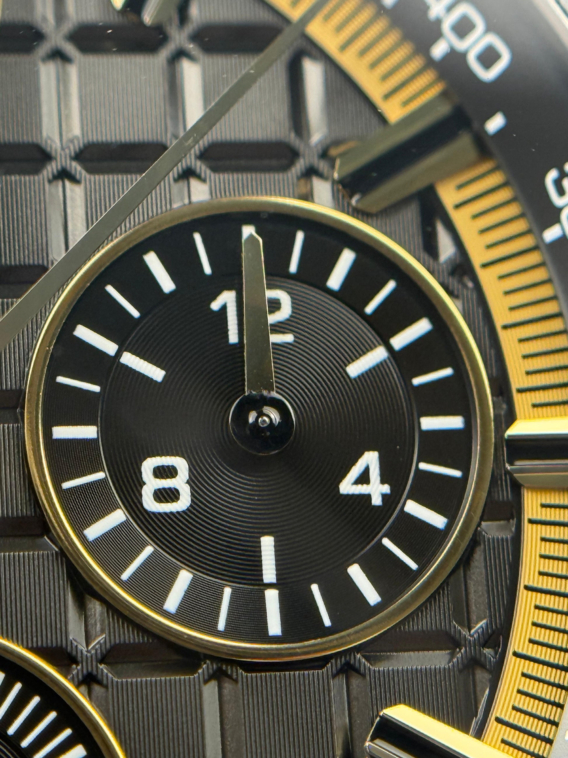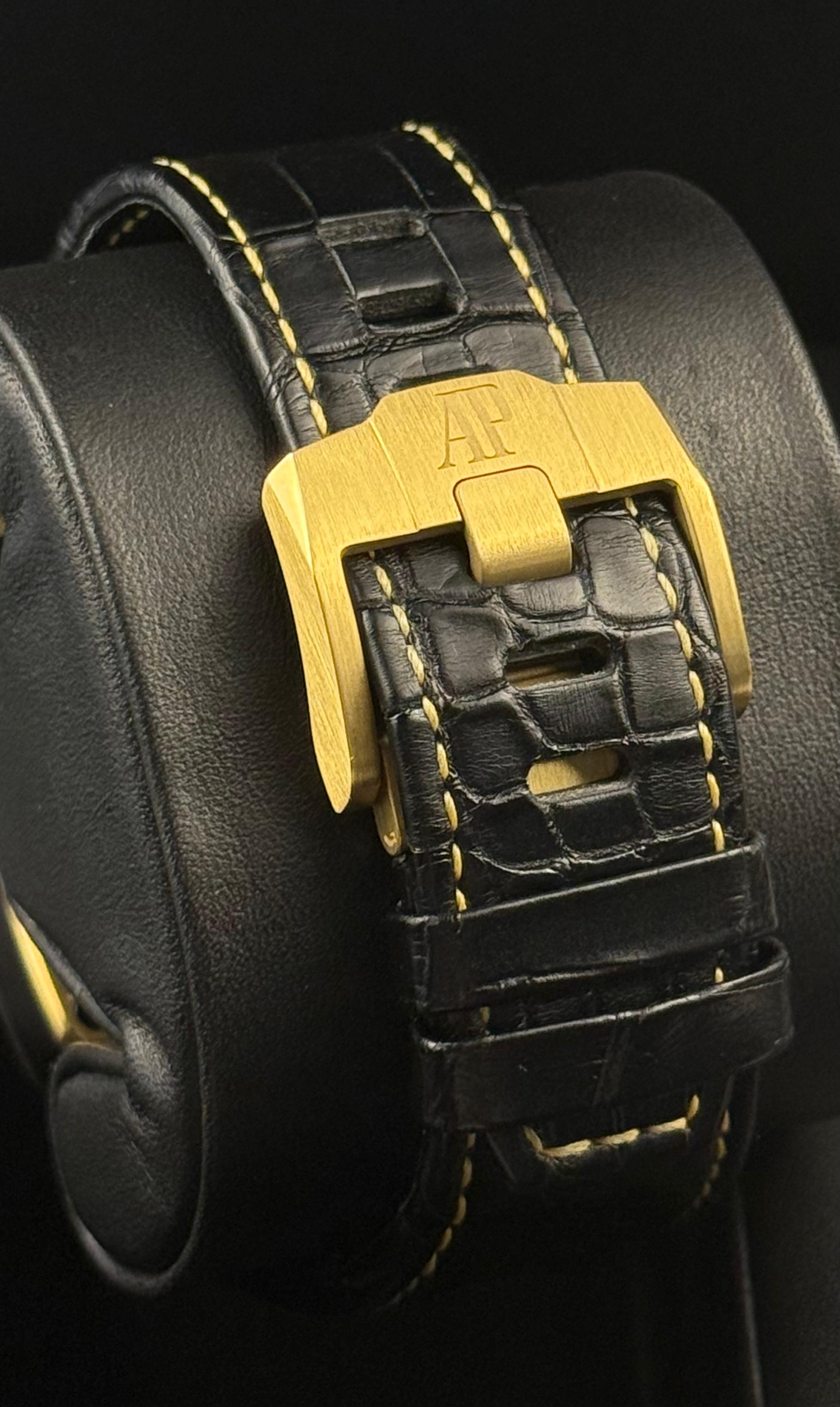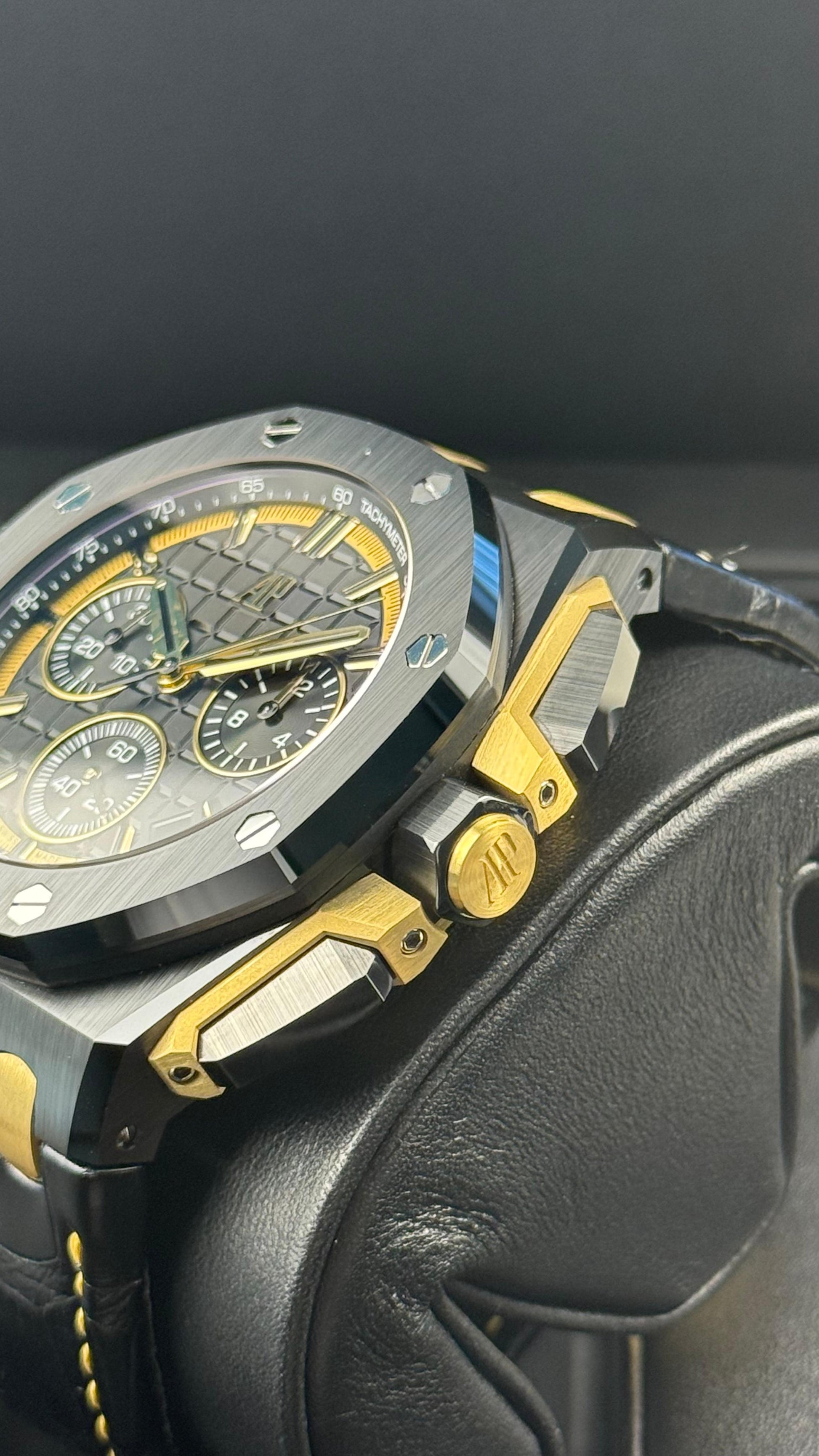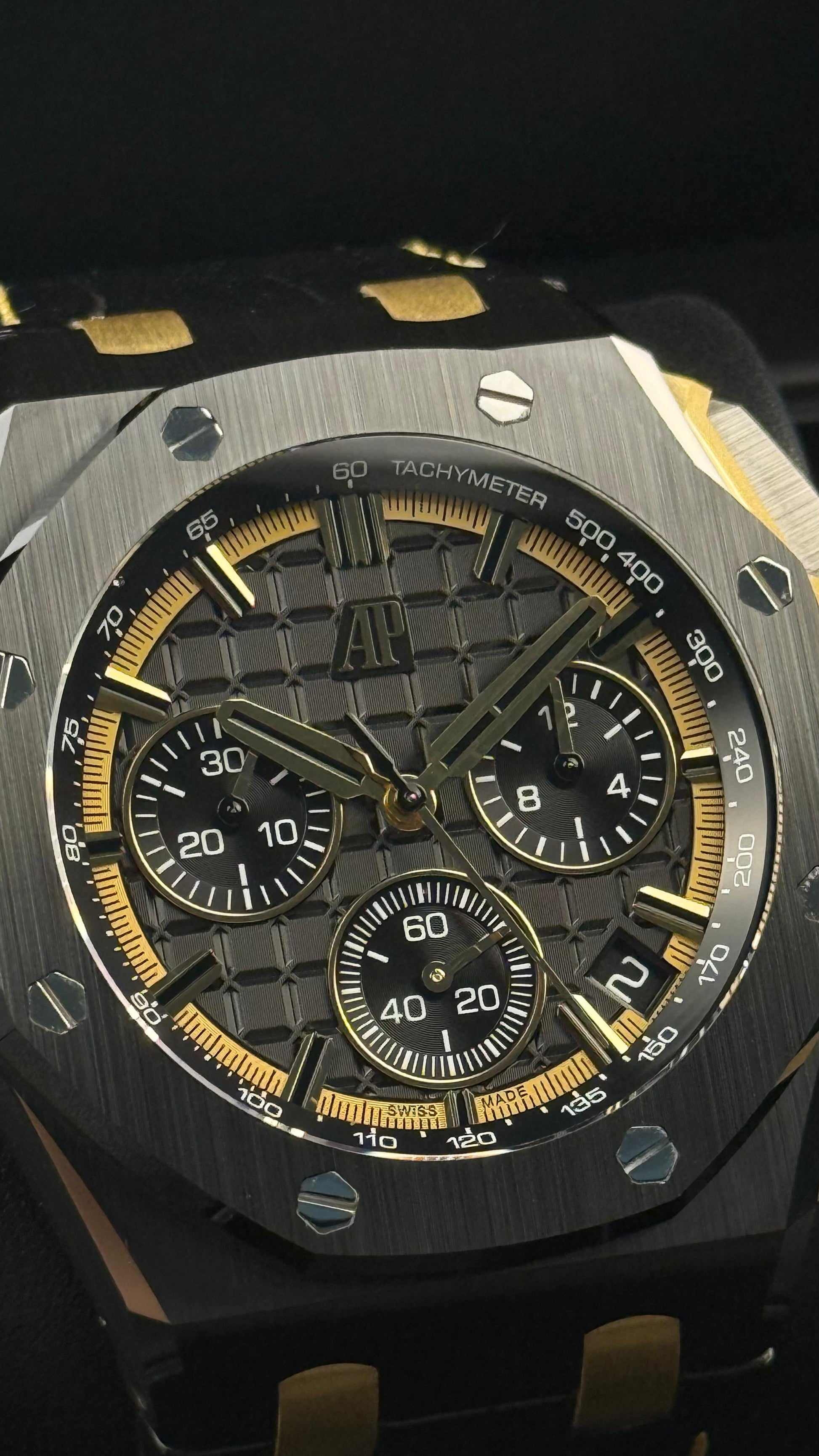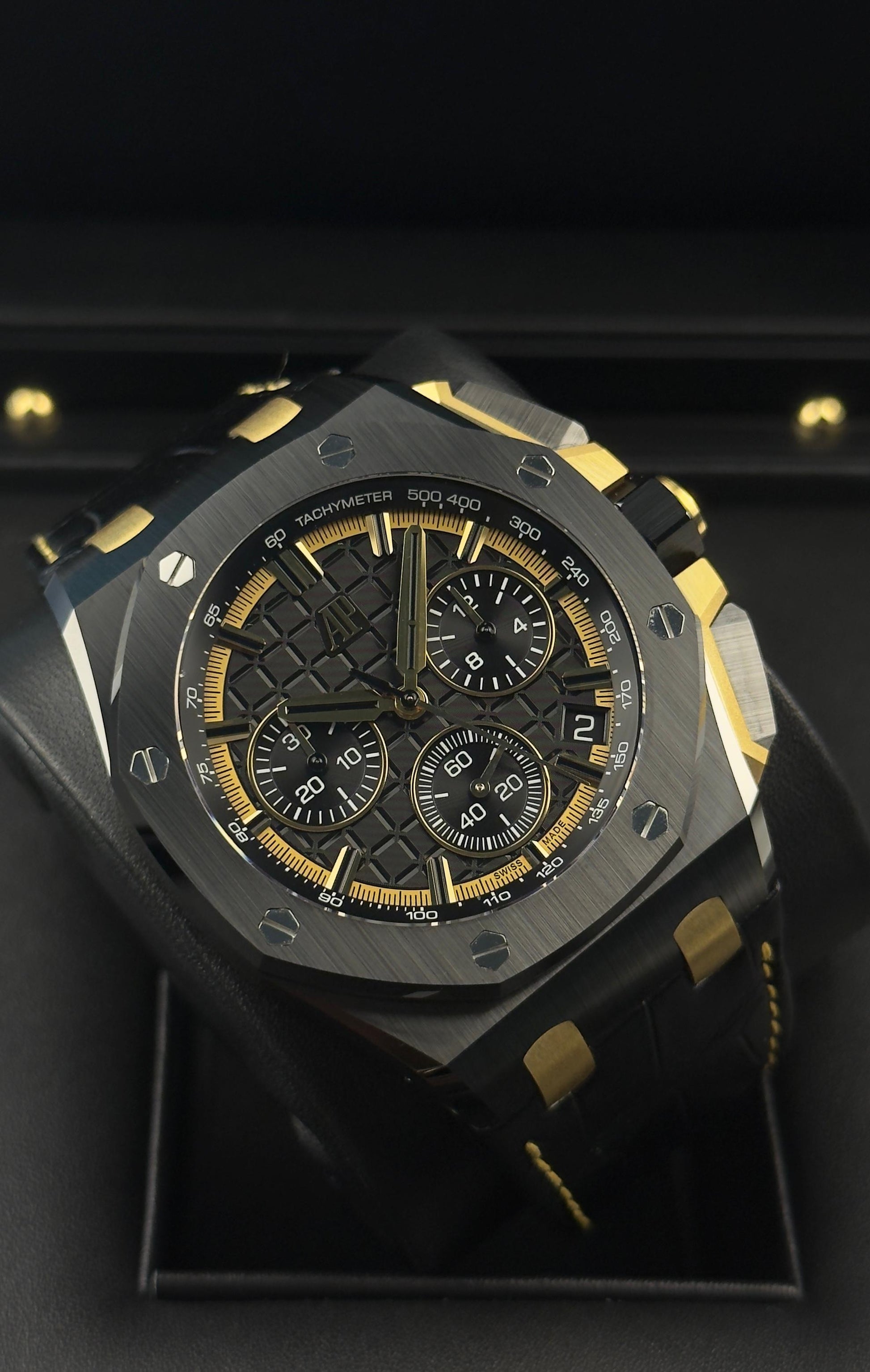Audemars Piguet Royal Oak Offshore Selfwinding Chronograph 26420CE.OO.A127CR.01, black ceramic and 18k yellow gold case on a strap with a 18k yellow gold tang buckle, newly designed in house AP caliber 4401 movement, 70-hour power reserve, flyback chronograph, featuring a new quick change system that allows the strap and buckle to be changed without tools, black ceramic bezel, crown and pushers, black "Mega Tapisserie" dial with applied luminous hour markers, luminous hands, date in between 4 and 5 o'clock, sapphire crystal, display back, water resistant to 100 meters.
