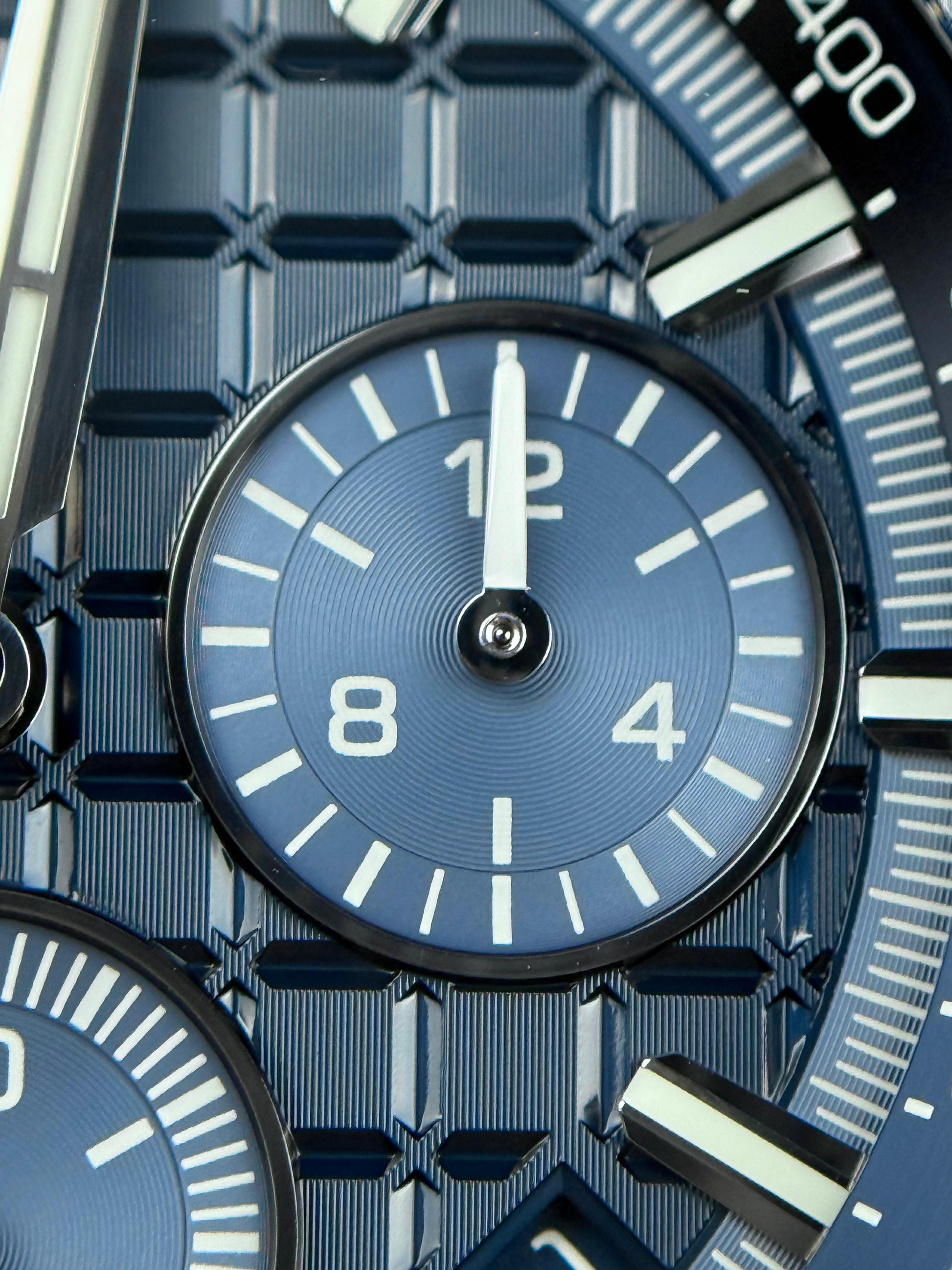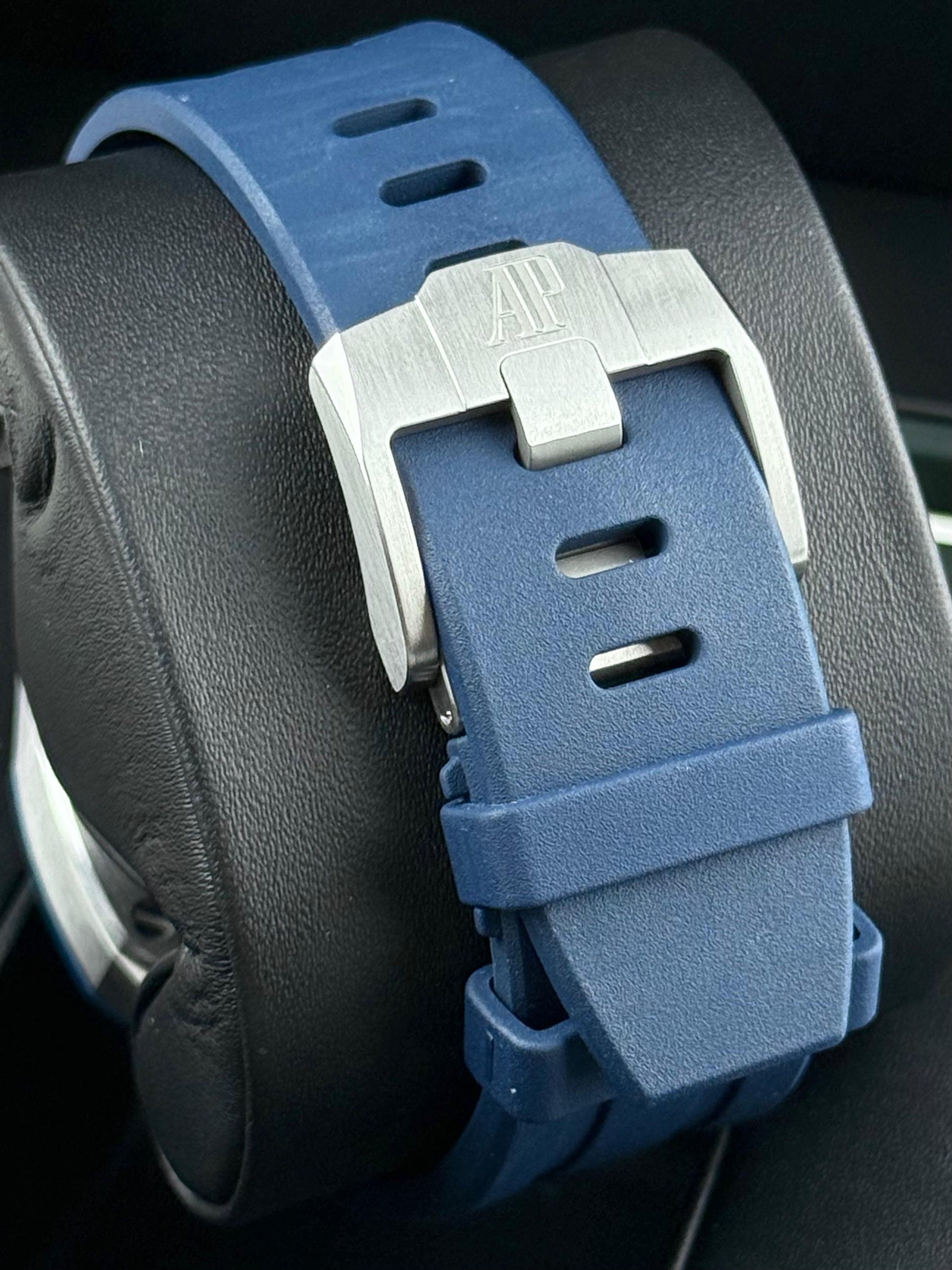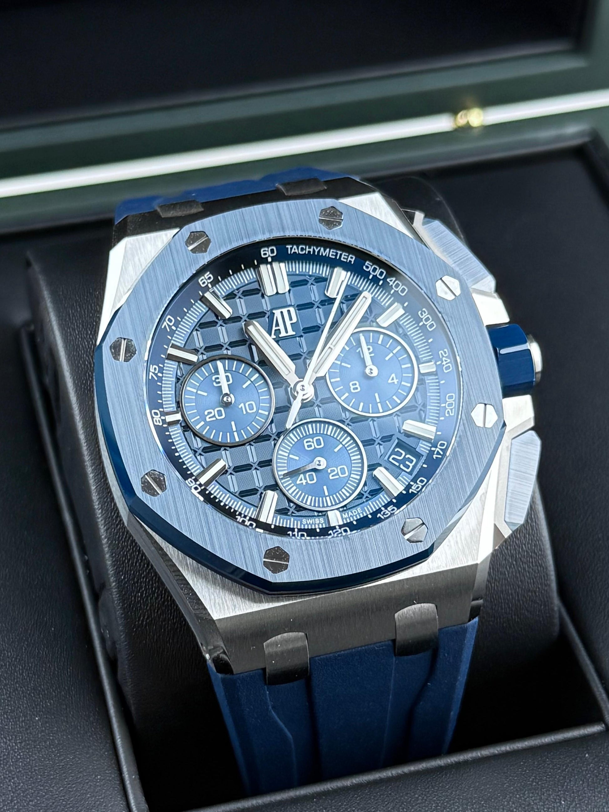 A bold evolution of AP’s iconic Offshore, this 2025 Royal Oak Offshore Chronograph features the striking “Bleu Nuit, Nuage 50” color way with ceramic bezel, pushers, and crown. In unworn condition and offered as a full set, this piece is powered by the in-house Calibre 4401 flyback chronograph with column wheel and 70-hour power reserve.