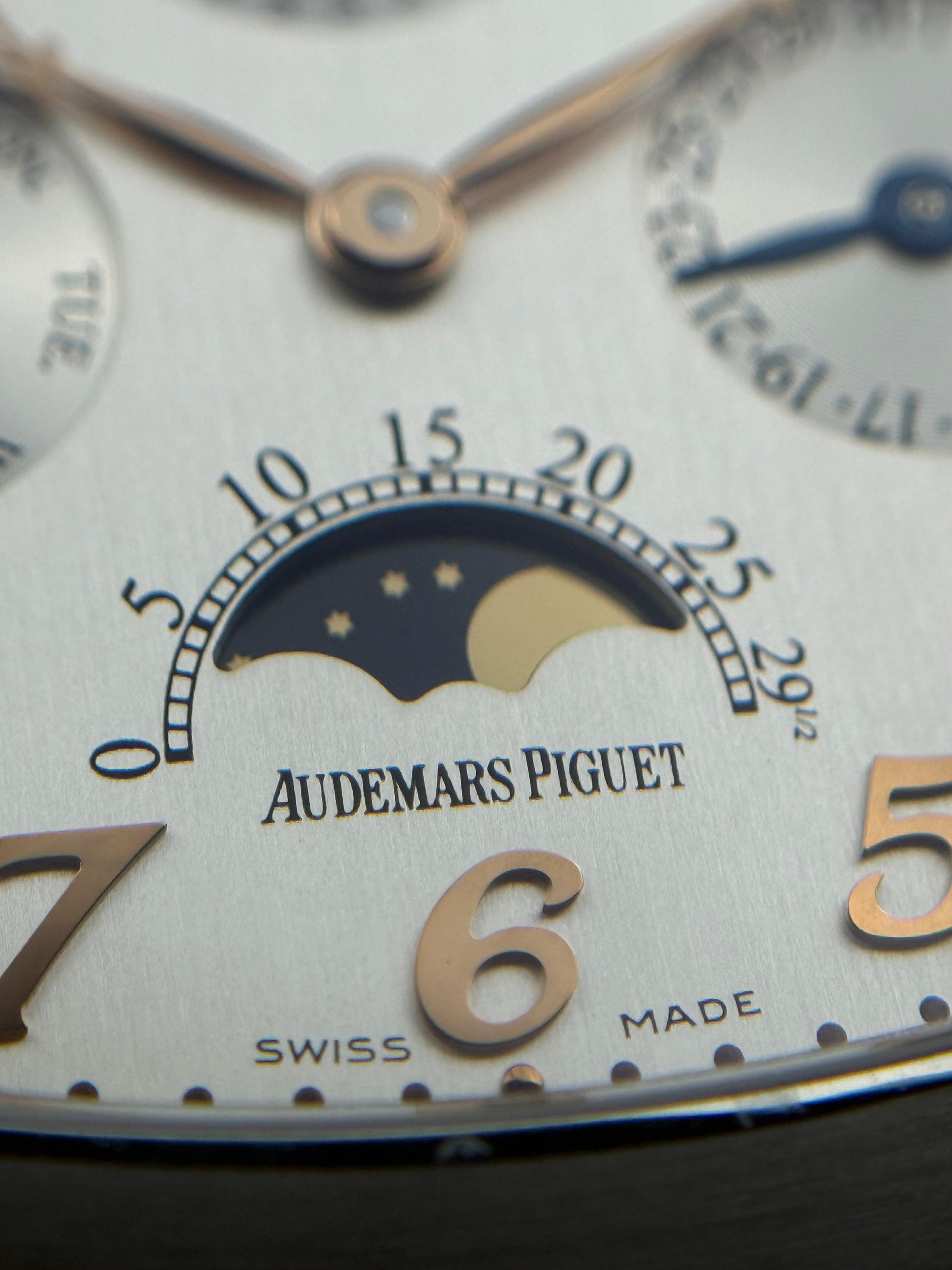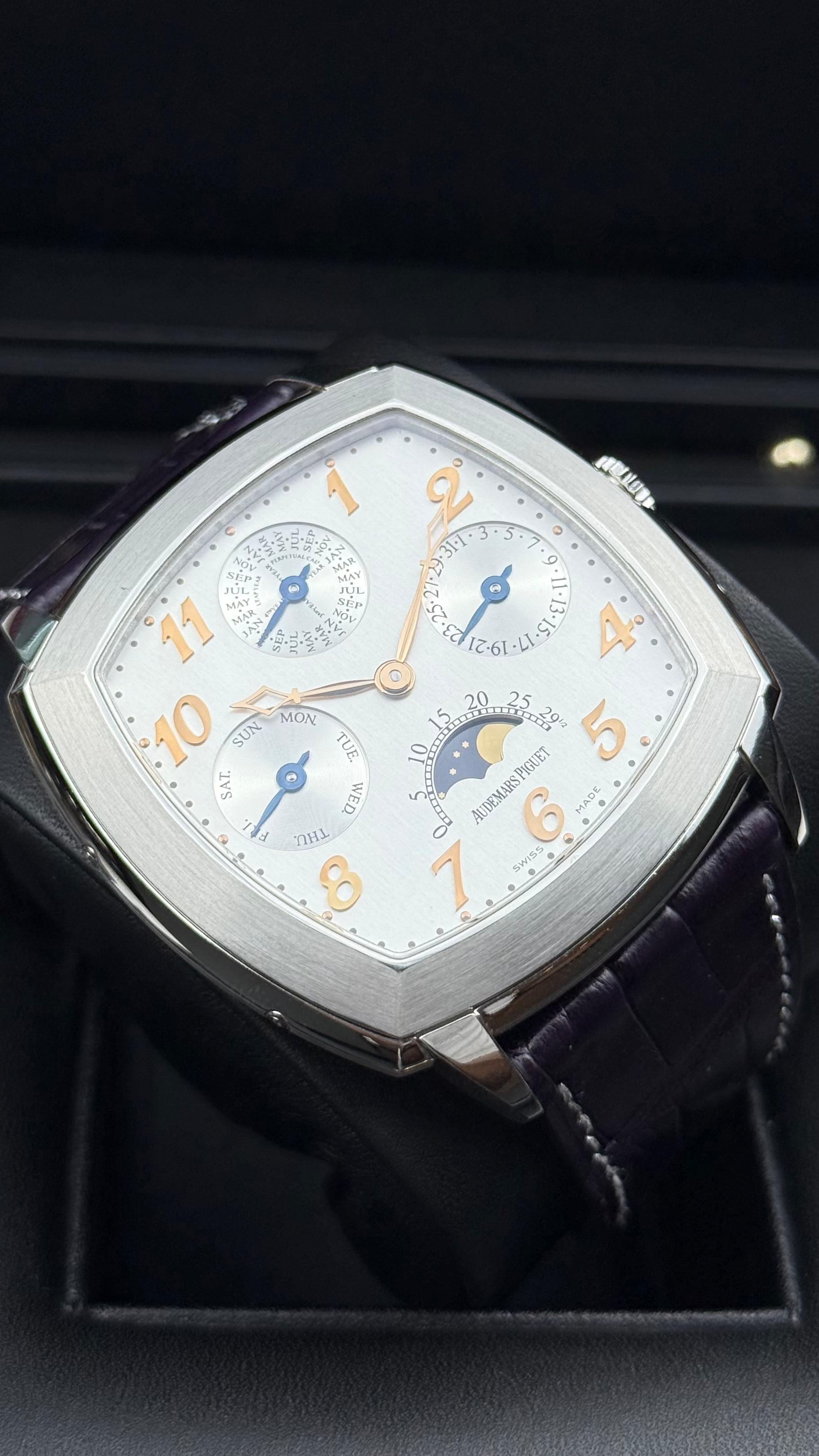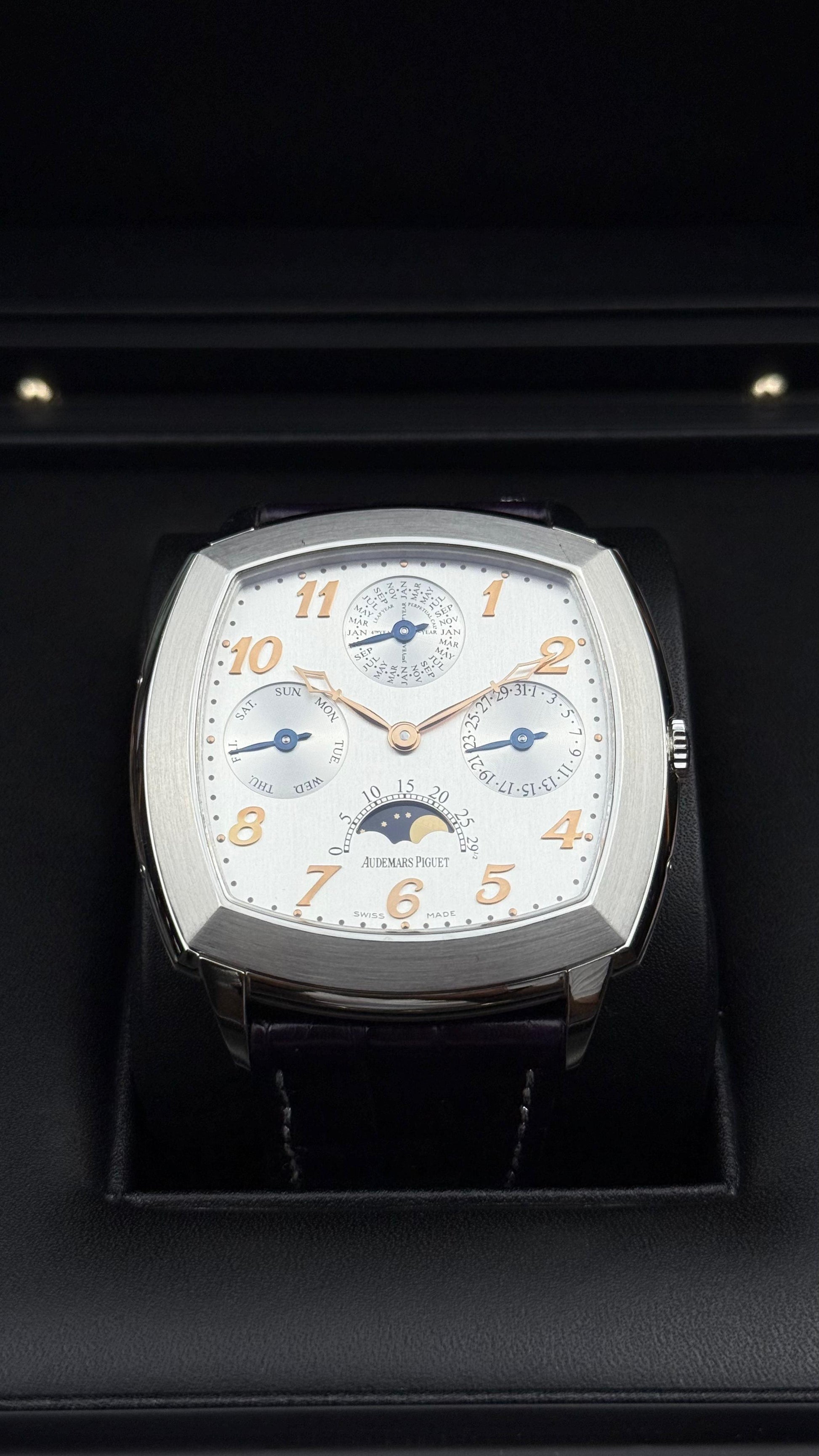 The Audemars Piguet Tradition Perpetual 47MM (Model 26051PT.00.D092CR.01) is a refined masterpiece that showcases the brand's dedication to blending traditional watchmaking artistry with modern innovation. Crafted in platinum, this elegant timepiece is a statement of exclusivity and high craftsmanship, representing the pinnacle of Audemars Piguet’s expertise in creating complex, luxurious, and aesthetically captivating watches