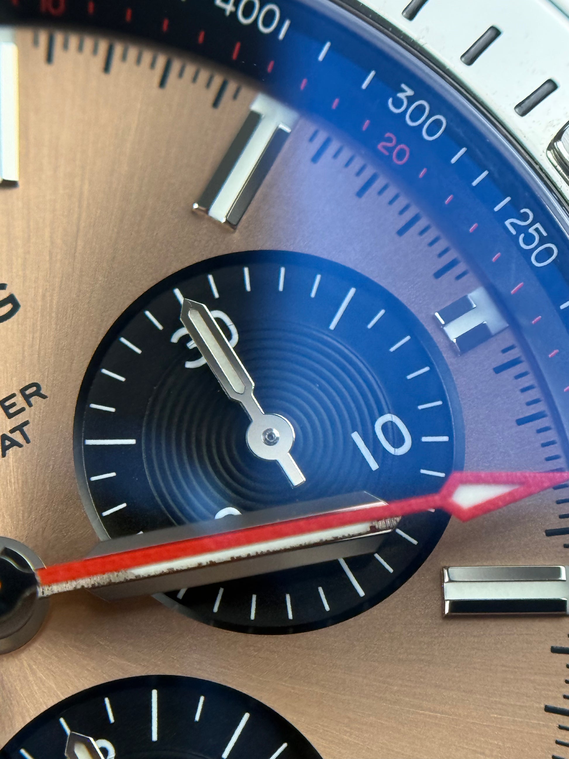 The dial layout includes a date window at 6 o’clock, a small running seconds sub-dial at 9 o’clock, and chronograph counters positioned at 3 o’clock for 30 minutes and 6 o’clock for 12 hours. The chronograph is driven by a column-wheel mechanism and highlighted by a bold red central seconds hand. A unidirectional rotating inner bezel with polished finish and brushed stainless steel quarter-hour rider tabs adds both functionality and signature Chronomat styling.