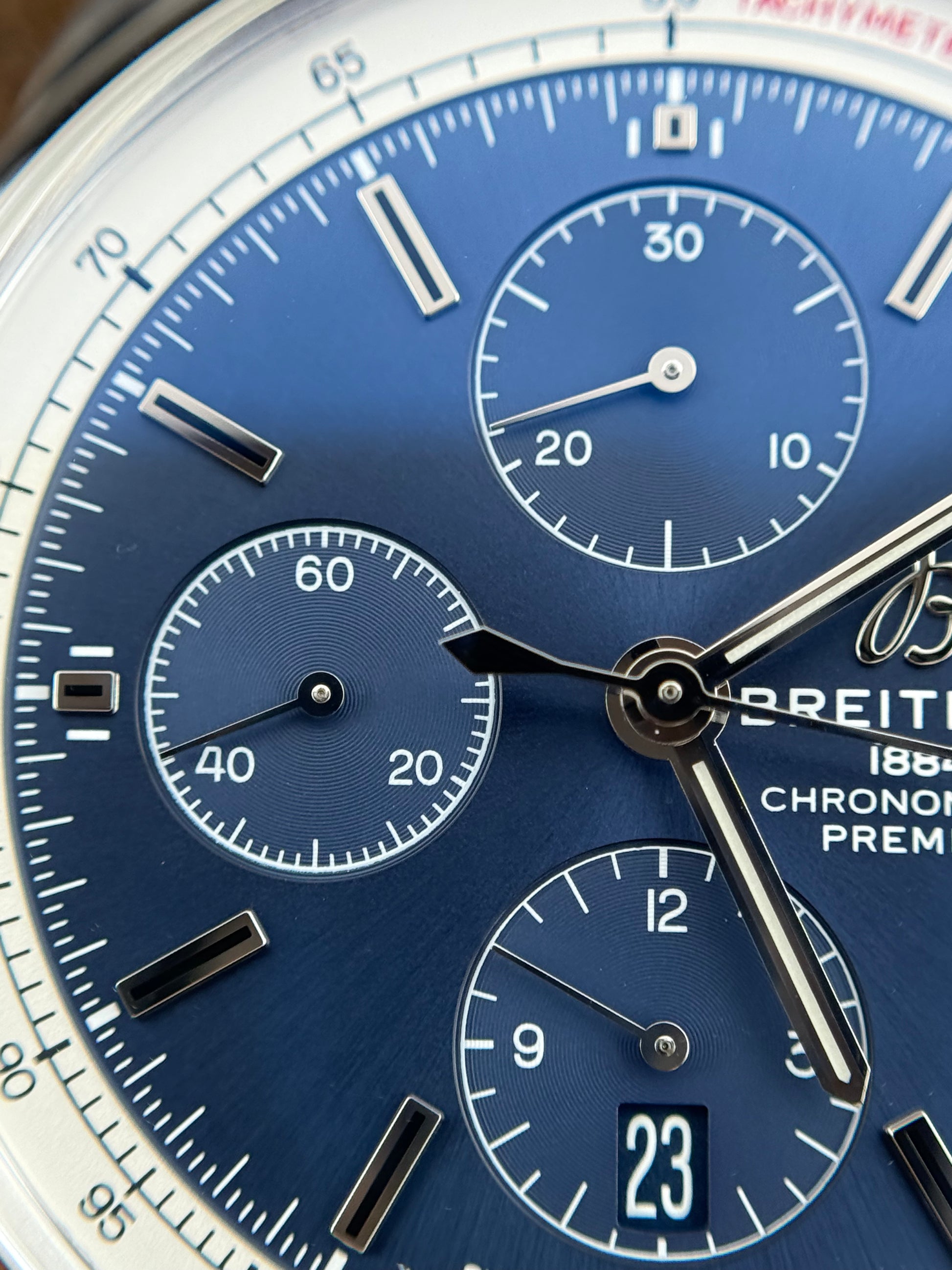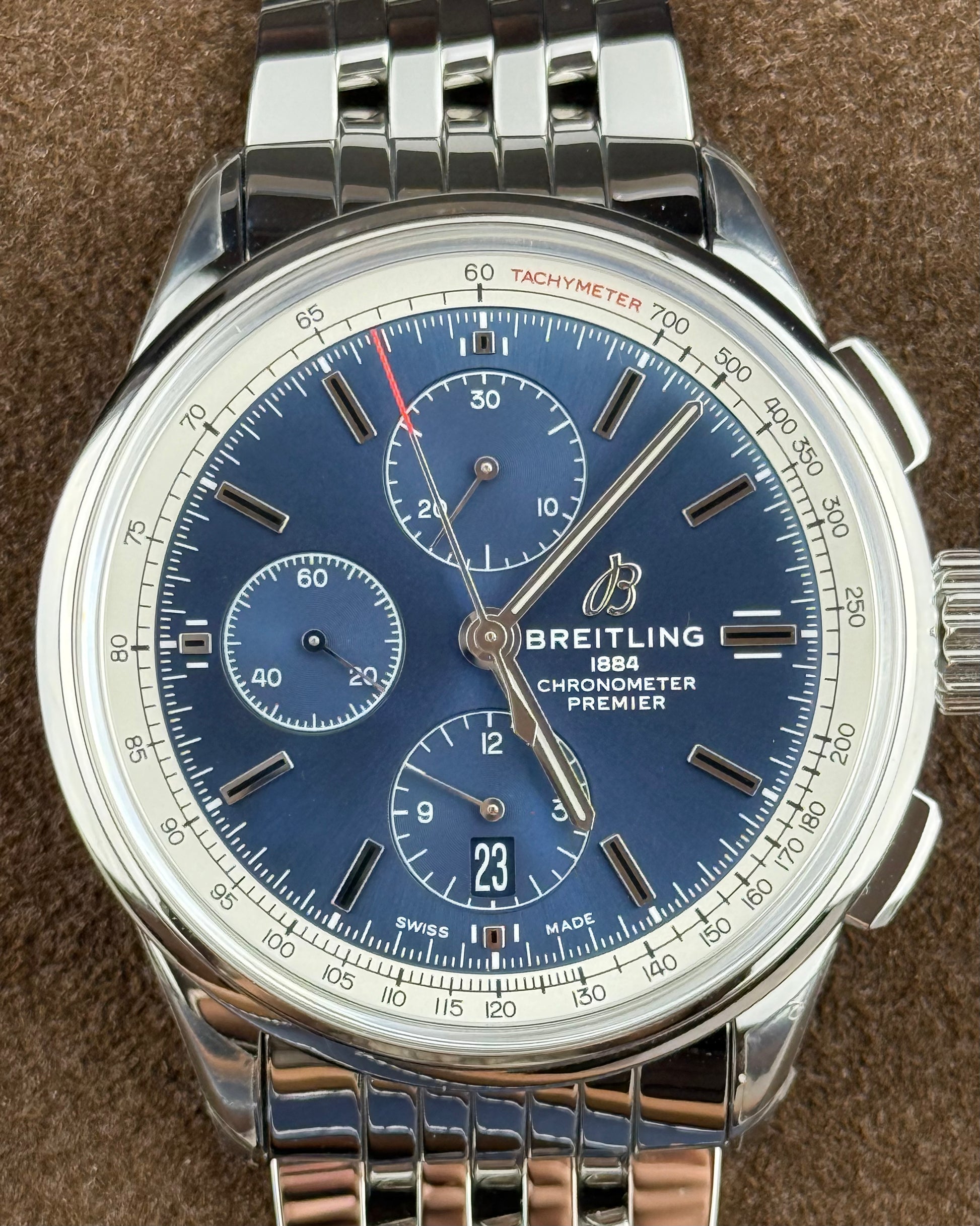 The watch is presented on a full-length stainless steel Breitling Navitimer bracelet, providing both comfort and a signature, sophisticated style. Ideal for collectors or enthusiasts seeking a versatile and impeccably crafted chronograph, this Premier Chronograph 42 embodies Breitling’s tradition of precision and timeless design.