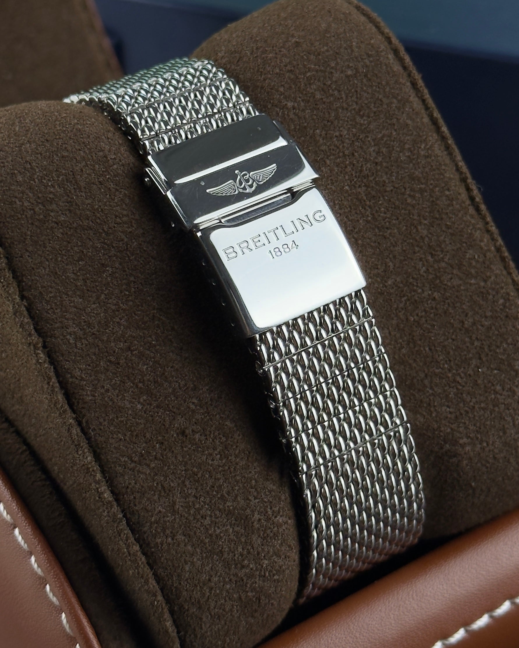 Powered by the Breitling Caliber 45 automatic movement, featuring 25 jewels and an approximate 42-hour power reserve, this watch delivers dependable precision. Completing the look is a polished stainless steel mesh bracelet secured with a deployment clasp. With water resistance up to 100 meters (330 feet), the Transocean Day & Date is a versatile and elegant companion for both professional and casual settings.