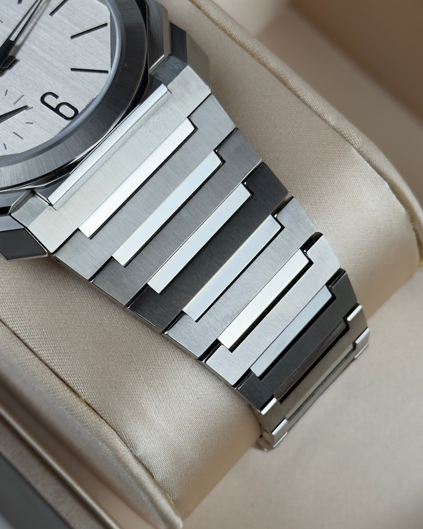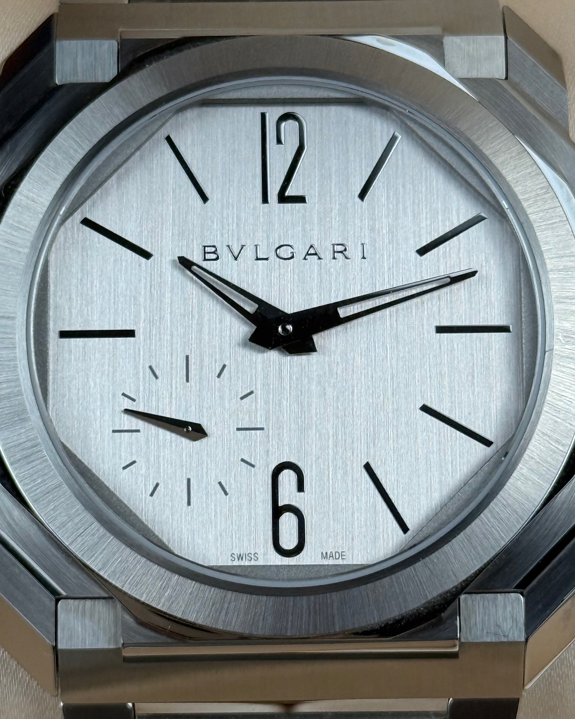 The Bvlgari Octo Finissimo is powered by a mechanical in-house automatic movement with a platinum micro-rotor, displaying hours, minutes, and small seconds, housed in an ultra-thin satin-polished stainless steel case with a transparent caseback, complemented by a polished screw-down crown with ceramic inlay, a silvered brushed dial, and a brushed stainless steel bracelet with polished accents and folding clasp, offering refined ultra-slim elegance with water resistance up to 100 meters.