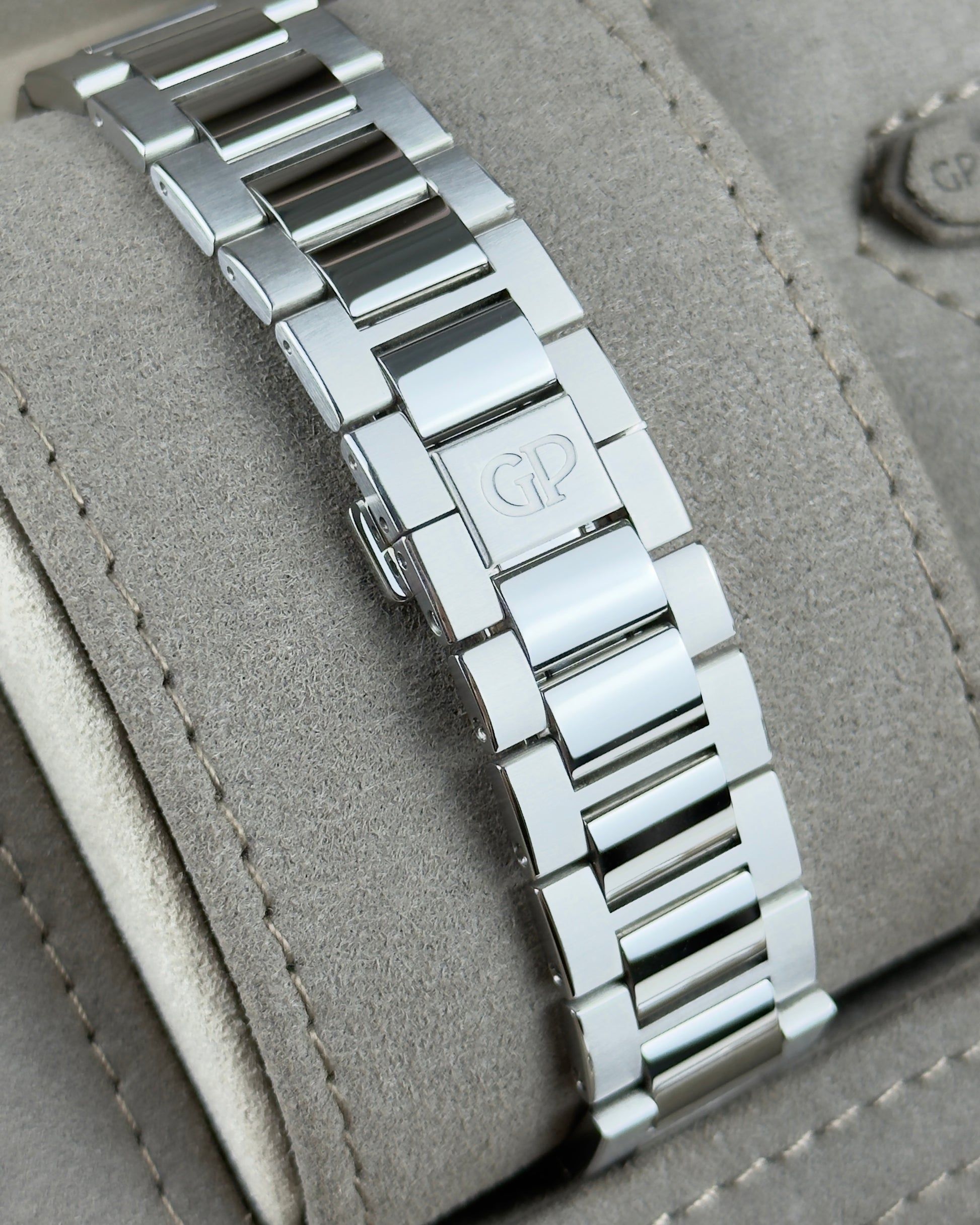 Limited edition of 188 pieces worldwide: An excellent condition 42mm case size stainless steel, calibre GP01800, automatic movement Girard-Perregaux Laureato Eternity Edition (81010-11-433-11A) featuring an in-house grand feu enamel green baton dial housing a date aperture at 3 O'clock surrounded by an octagonal-shaped stainless steel bezel. This particular watch comes on a full retail length integrated Girard-Perregaux stainless steel bracelet and is complete with its Girard-Perregaux box