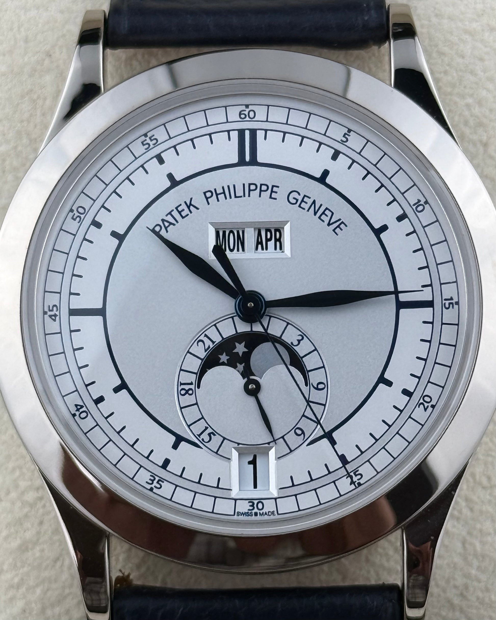 The Patek Philippe Complications 5396G-001 is a distinguished expression of classic haute horology, crafted for those who appreciate refined complexity and timeless design. Encased in a 38.5mm 18K white gold case with a matching white gold bezel, this exceptional timepiece features a sophisticated silver dial accented by striking blue hands and elegant white gold index hour markers. Its annual calendar complication seamlessly displays the day, date, and month, complemented by a beautifully integrated moon phase indicator that adds both function and poetic charm. Paired with a black leather strap and secured by an 18K white gold deployment buckle, it offers a comfortable fit for wrists up to 7.5 inches. Finished with a sapphire crystal, a transparent sapphire case back, and powered by an automatic self-winding movement, the 5396G-001 exemplifies Patek Philippe’s mastery of precision, craftsmanship, and enduring elegance.