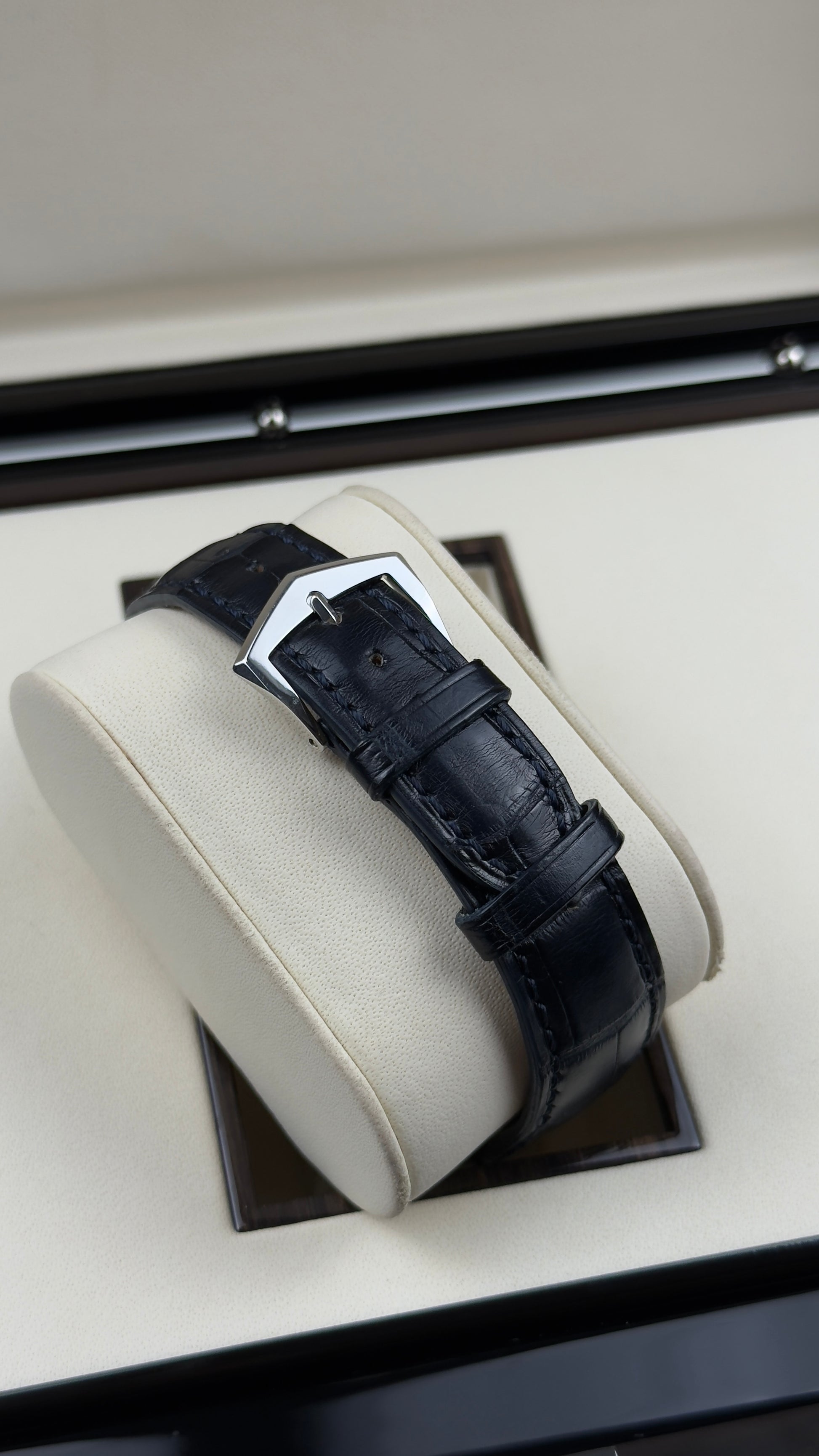 The watch is completed with a hand-stitched navy blue alligator leather strap featuring a platinum prong buckle, while the sapphire crystal case back reveals the impeccable craftsmanship within. Measuring 14.03mm in thickness, water-resistant to 30 meters, and paired with a timeless platinum bezel, this piece epitomizes Patek Philippe’s mastery of complications.