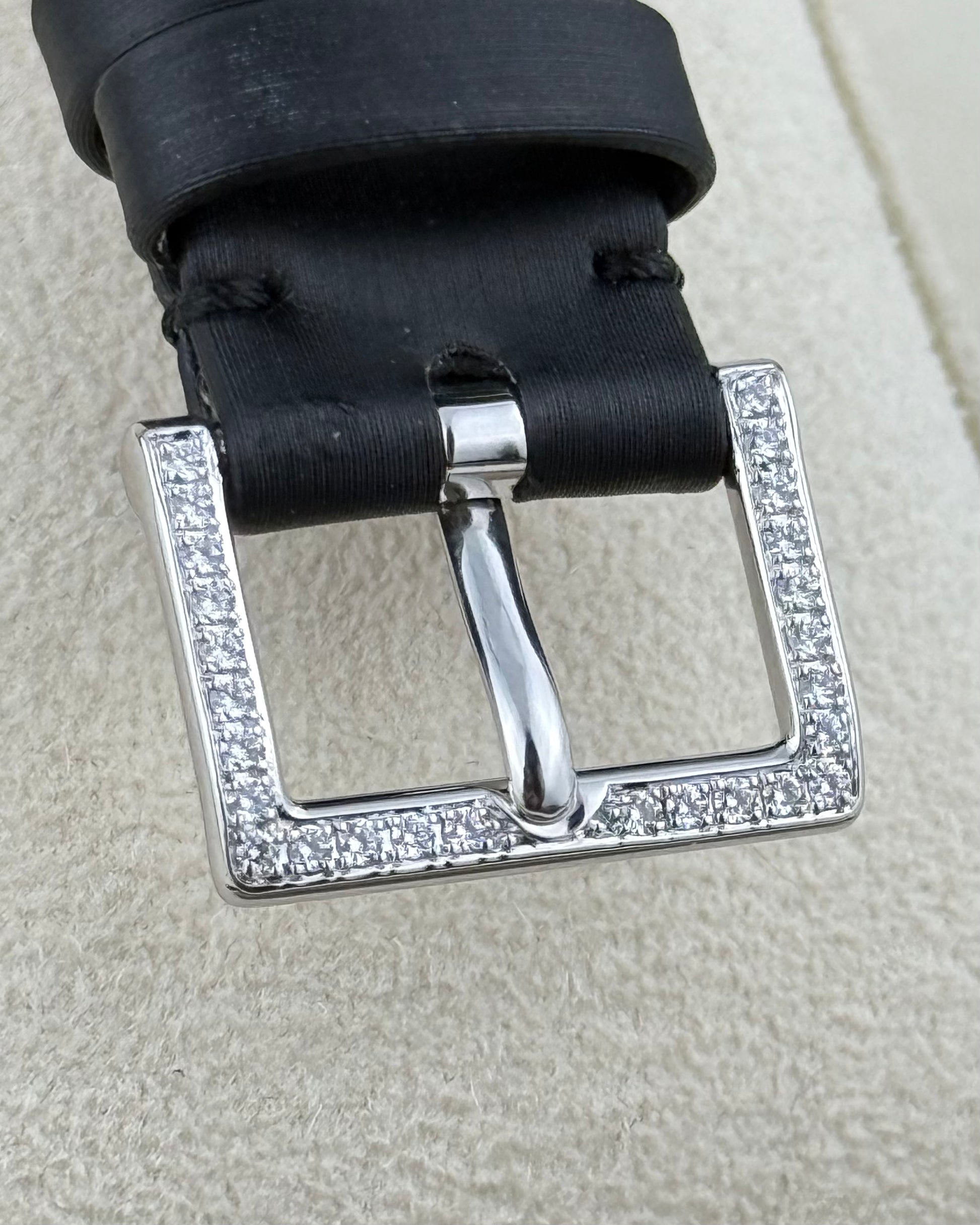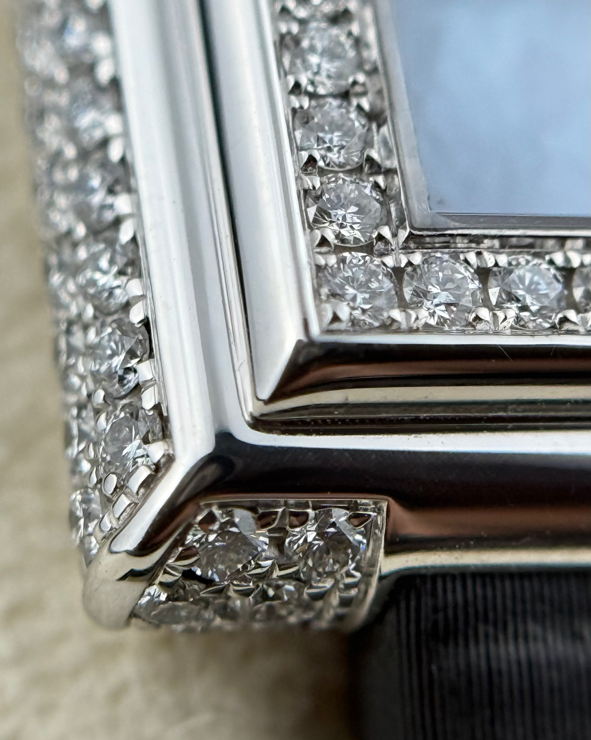 The Patek Philippe Gondolo 4869G-1G is a stunning ladies’ timepiece that embodies elegance and refined craftsmanship. Featuring a 25mm square case in 18kt white gold with a matching 18kt white gold bezel, this watch exudes timeless sophistication. The black mother-of-pearl dial is adorned with silver-tone hands and Roman numeral hour markers, creating a striking contrast and ensuring clear readability. Powered by a precise quartz movement and protected by a scratch-resistant sapphire crystal, it combines reliability with luxury. Paired with a blue satin bracelet, this Gondolo 4869G-1G is a versatile accessory that perfectly complements formal and casual ensembles, exemplifying Patek Philippe’s signature blend of artistry and horological excellence.