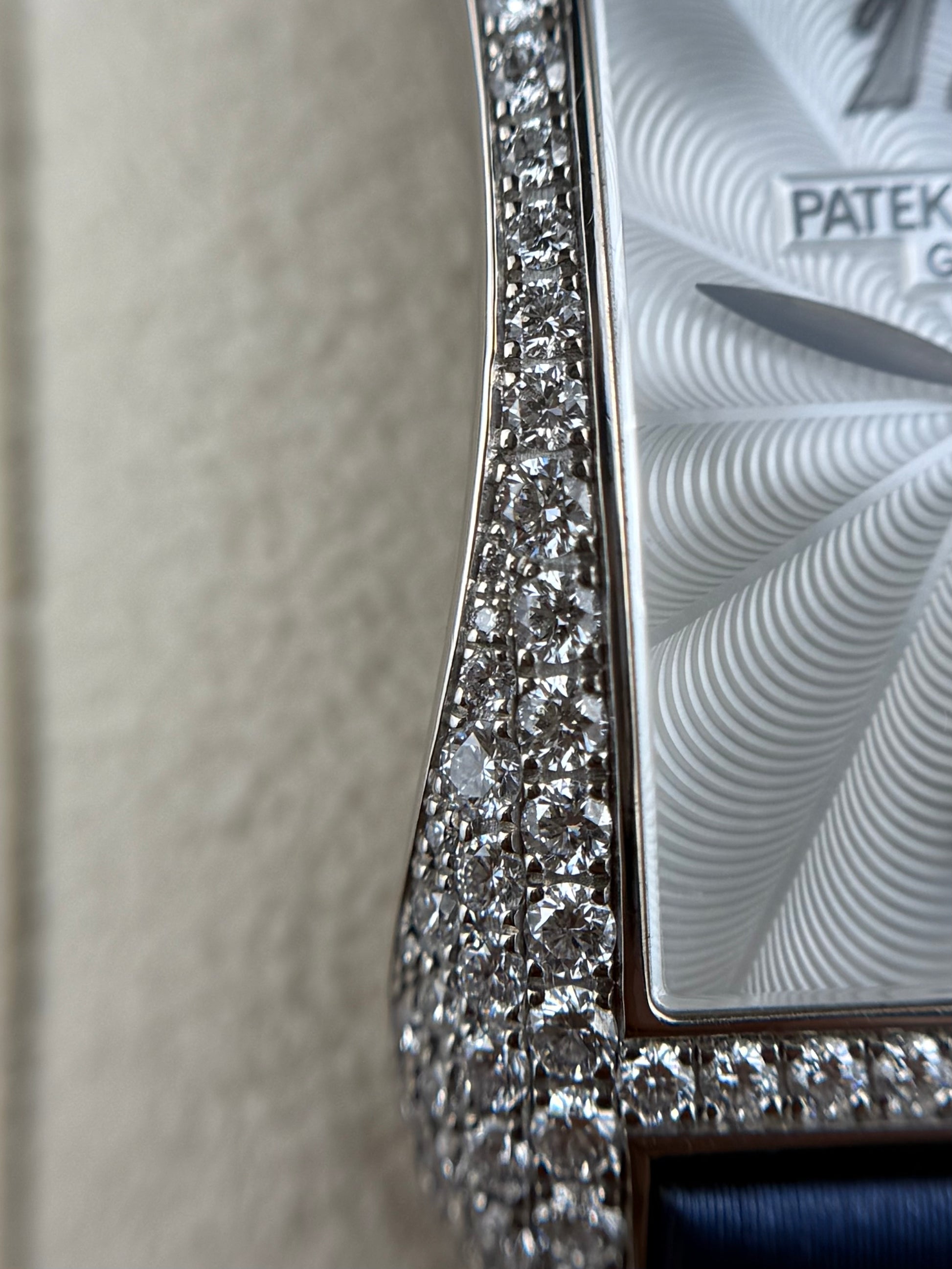 The Patek Philippe Gondolo 4972G-001 is a refined expression of timeless elegance, crafted in luxurious white gold with a beautifully proportioned 27.4 x 39.7 mm case that reflects the brand’s Art Deco heritage. Its exquisite guilloché mother-of-pearl dial radiates sophistication, perfectly complemented by elegant golden hands and a sleek fixed bezel. Powered by the precise Caliber E15 quartz movement with six jewels, this timepiece delivers reliable performance and long-lasting efficiency, supported by an impressive battery life of up to three years. Finished with a refined synthetic fabric strap secured by a classic pin buckle and offering water resistance up to 30 meters, the Gondolo 4972G-001 is a graceful blend of understated luxury, precision craftsmanship, and enduring style.