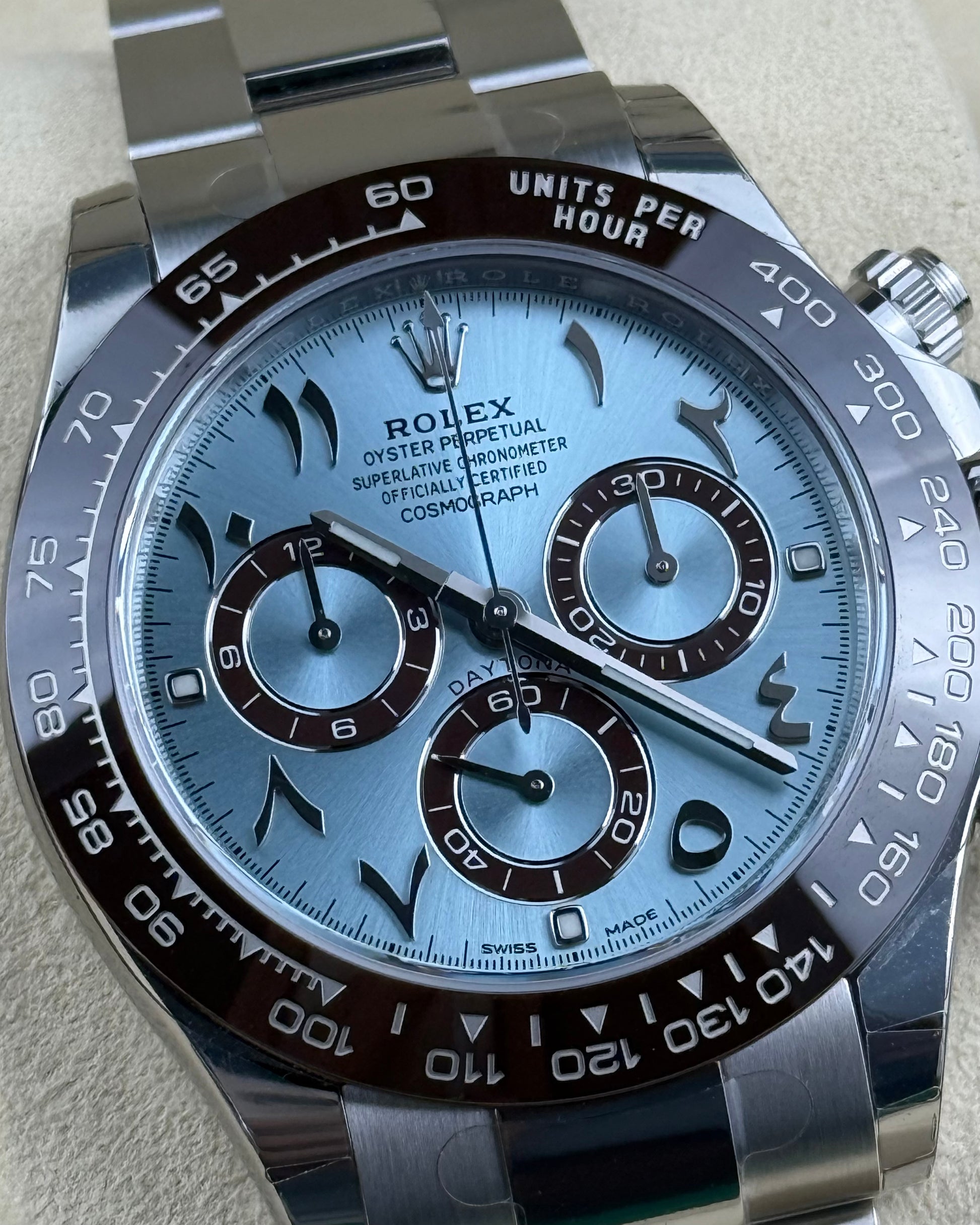Crafted from 950 platinum, it features the iconic ice-blue hindi numeral dial complemented by a chestnut brown Cerachrom bezel — a true symbol of exclusivity and performance in the world of fine watchmaking.