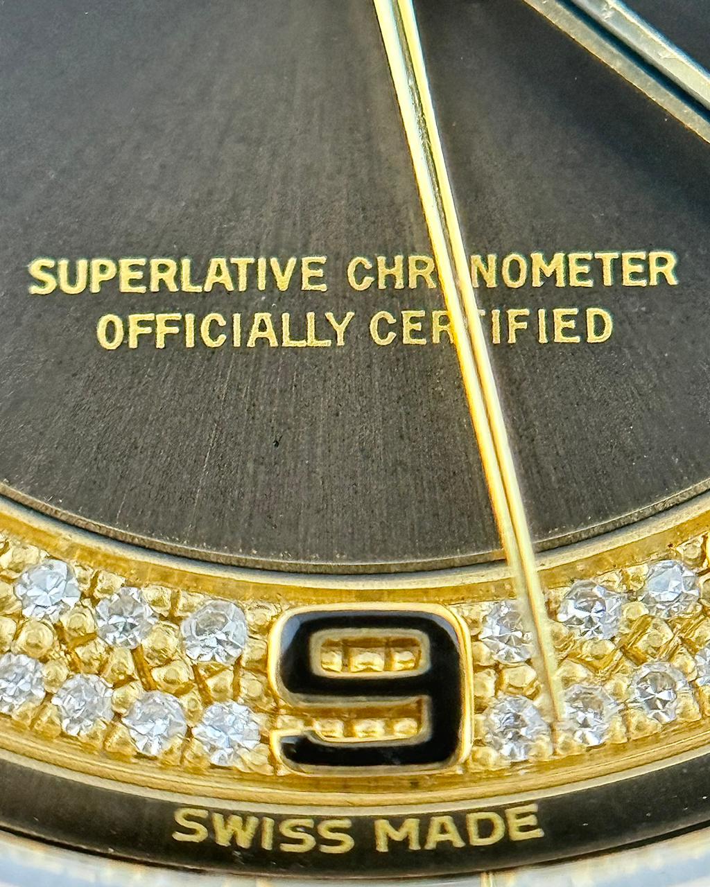 This exceptional Rolex Day-Date Reference 18238 in 18k yellow gold features a rare grey “myriad” diamond dial, making it a truly distinctive collector’s piece. this watch is presented in impressive overall condition and comes as a full set, including original double-punched papers, the green serial hang tag, and provenance from Beyer, Zurich, Switzerland. With its combination of luxurious materials, unique dial, and complete original documentation, this Day-Date 18238 is a highly desirable item for discerning collectors.