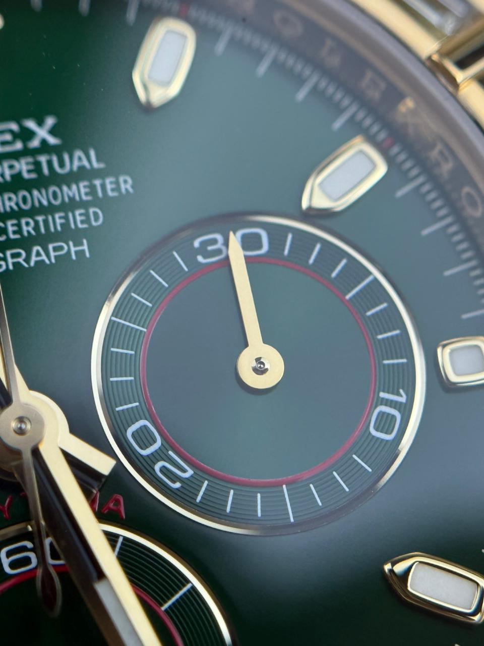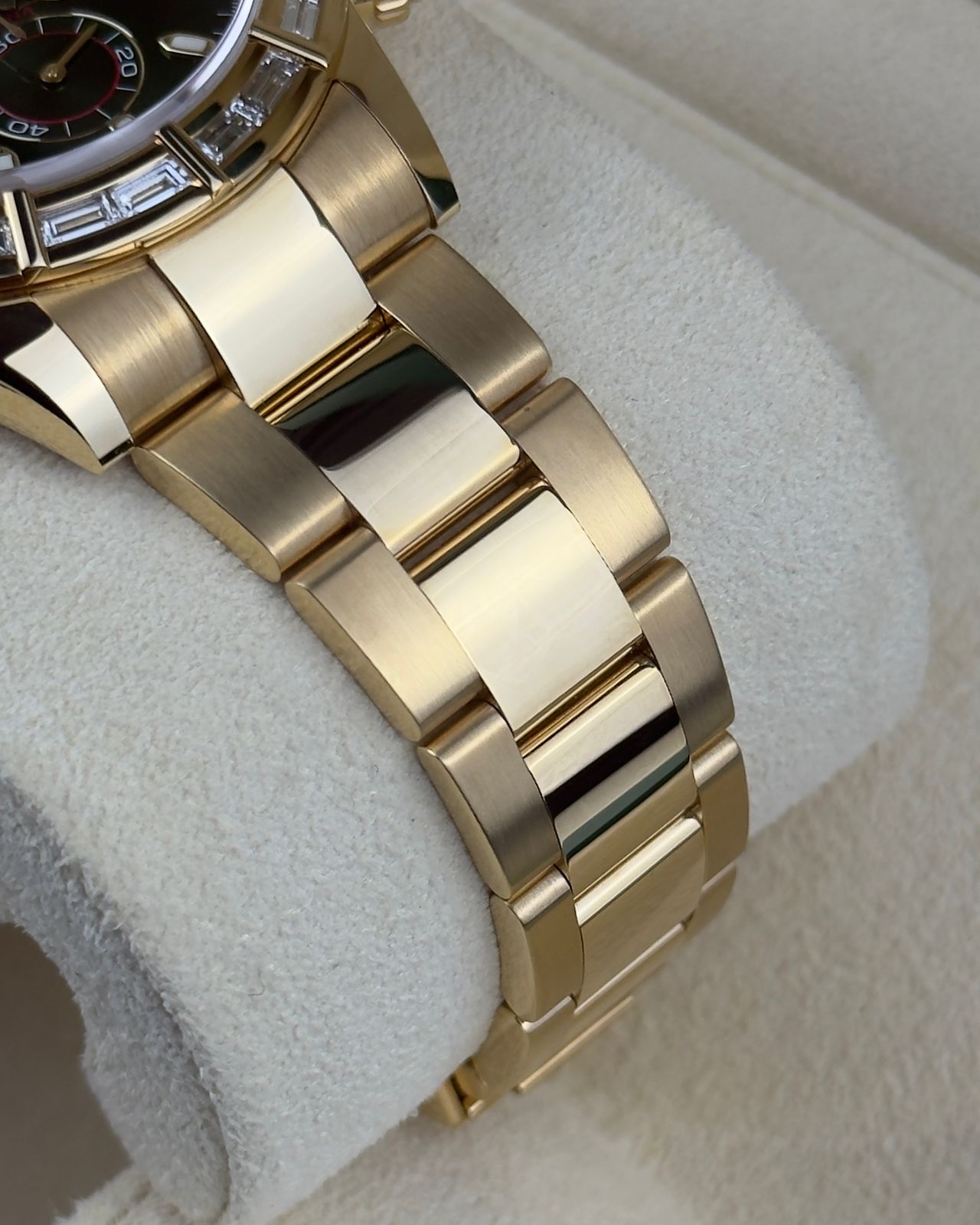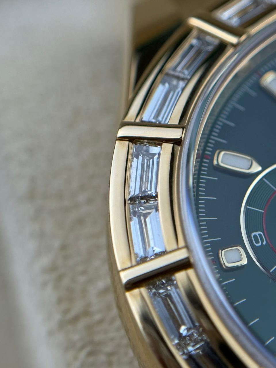 The Rolex Daytona “John Mayer” Reference 116568BR is an extraordinary statement of luxury and exclusivity. Executed entirely in 18k yellow gold, the 40mm case is paired with the highly sought-after green dial, further elevated by a factory-set baguette diamond bezel that delivers remarkable presence. Inside, Rolex’s renowned Caliber 4130 chronograph movement offers exceptional precision along with a 72-hour power reserve, underscoring the brand’s technical mastery. The matching 18k yellow gold Oyster bracelet provides outstanding comfort and strength, while the Triplock screw-down crown and 100-meter water resistance preserve the Daytona’s robust, performance-driven character. Accompanied by its original box and papers, this reference is among the most coveted modern Rolex models, seamlessly combining prestige, performance, and rarity.