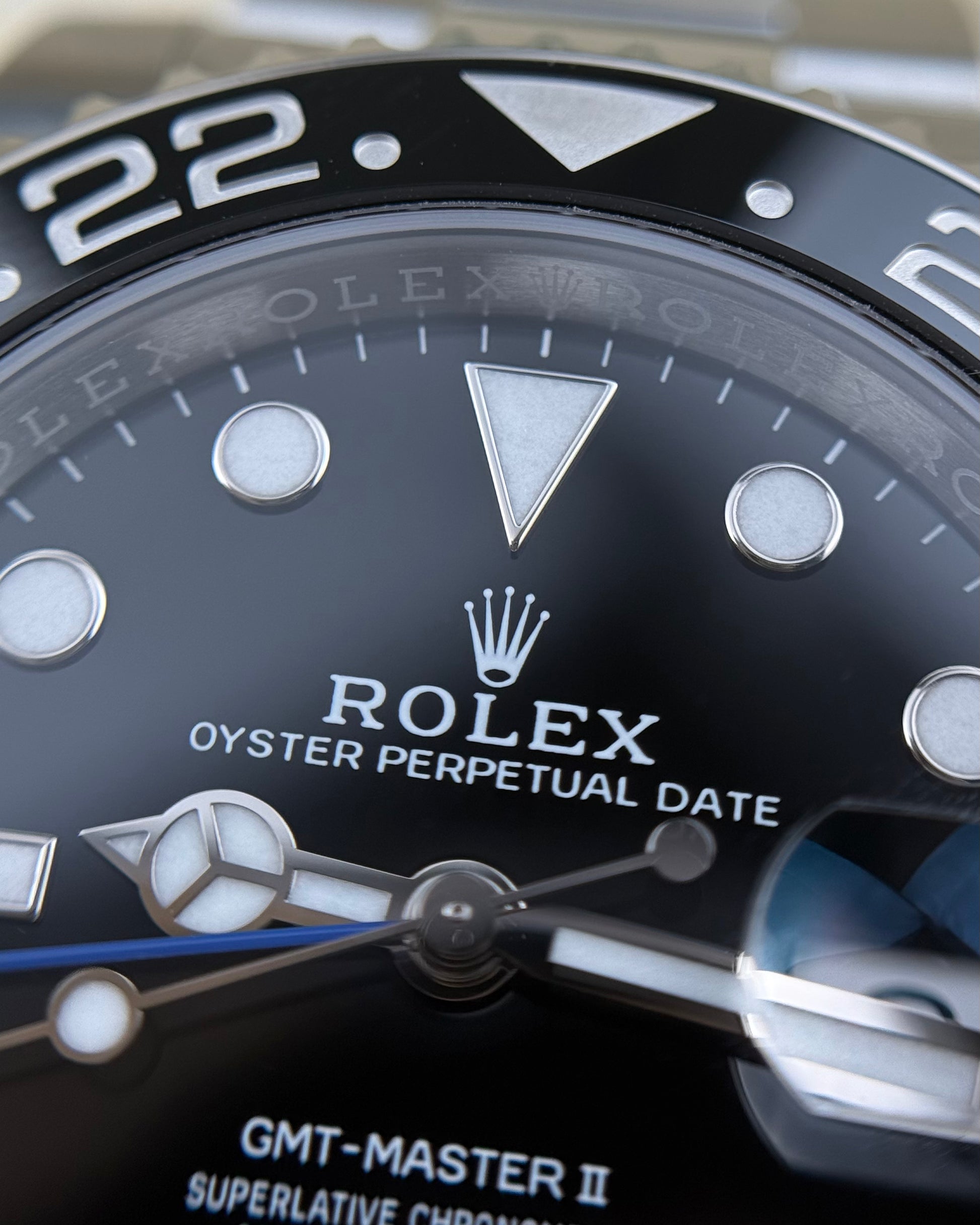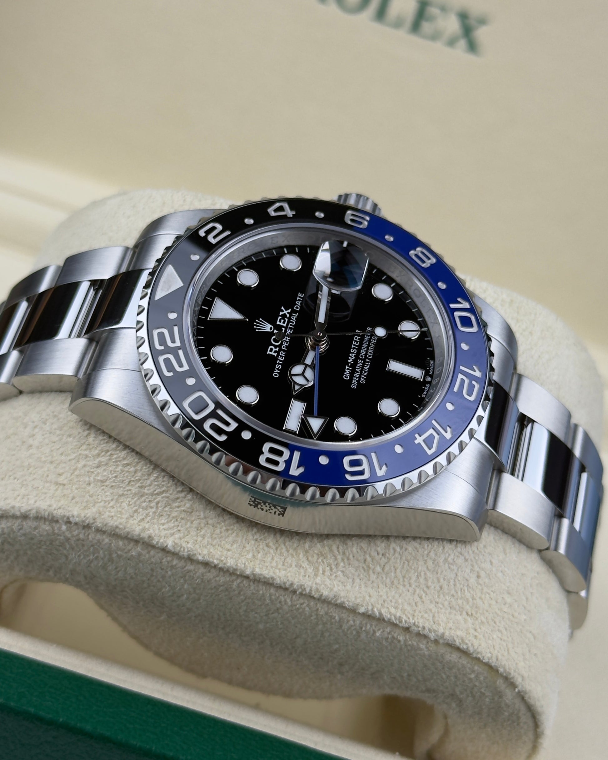 The Rolex GMT-Master II Ref. 126710BLNR is the second generation of the iconic dual-time watch, now featuring the highly durable Cerachrom ceramic bezel, developed in-house by Rolex for superior scratch resistance. This model is instantly recognizable by its bold blue and black bezel, earning it the nickname “Batman”. Crafted in stainless steel and fitted with a classic Oyster bracelet, it also features the practical Easylink extension system, allowing quick adjustment for enhanced comfort. Designed for both travel and daily wear, the 126710BLNR blends technical innovation with unmistakable style.