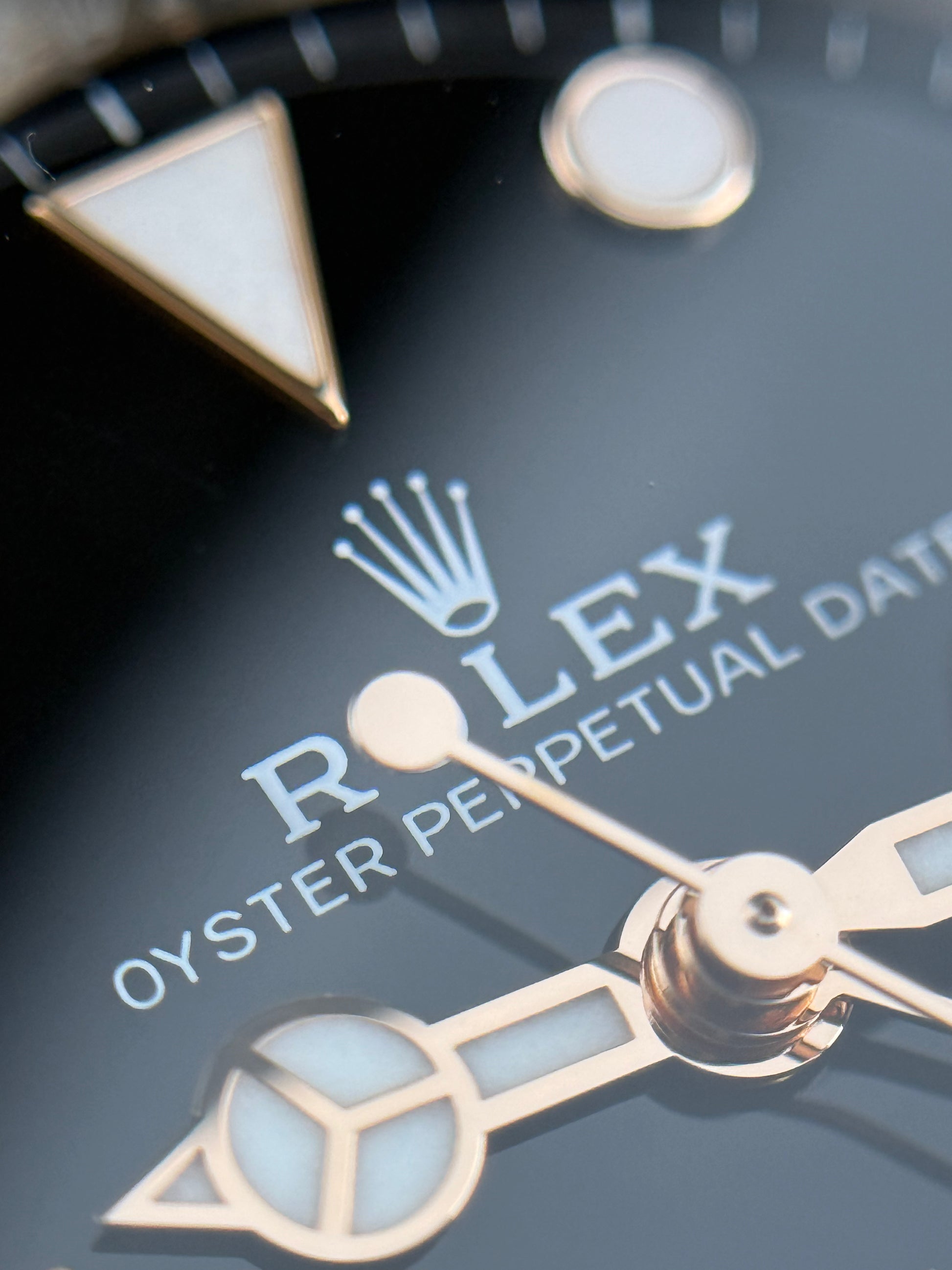 This model features a 40 mm Everose Rolesor case with an Oystersteel monobloc middle case, complemented by a screw-down Everose gold crown. The Everose gold bidirectional rotatable bezel is graduated for 24 hours and fitted with a brown and black Cerachrom insert with engraved numerals. A scratch-resistant sapphire crystal with a Cyclops lens over the date protects the black dial, which is equipped with hour markers set with Chromalight for enhanced visibility.