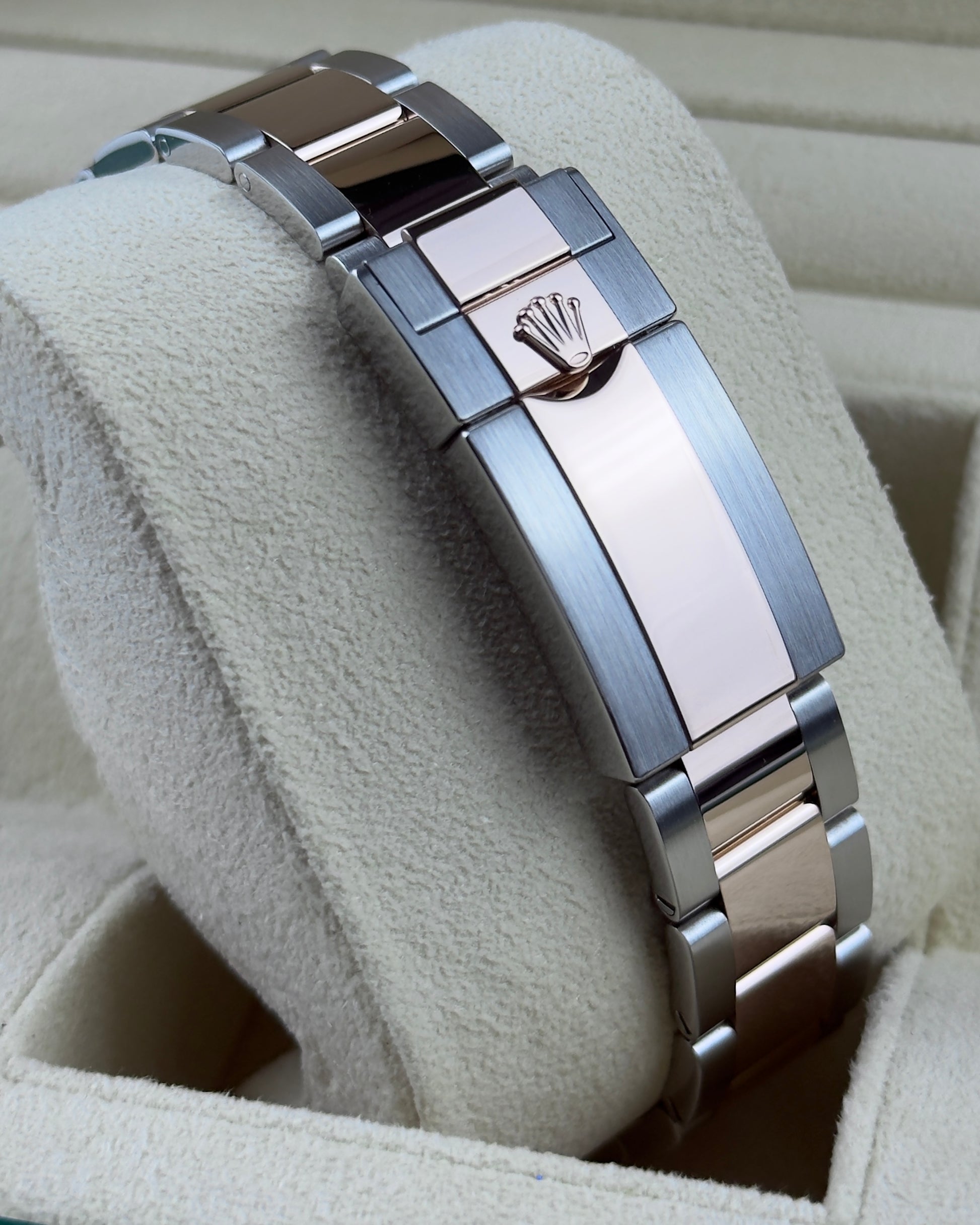 Powering the watch is the Rolex Caliber 3285 self-winding movement, featuring a second time-zone hour hand, instantaneous date function, and an approximate 70-hour power reserve. The timepiece is paired with an Everose Rolesor Oyster bracelet with flat three-piece links, secured by a folding Oysterclasp buckle with an Easylink 5 mm comfort extension. It is water-resistant to 100 meters.