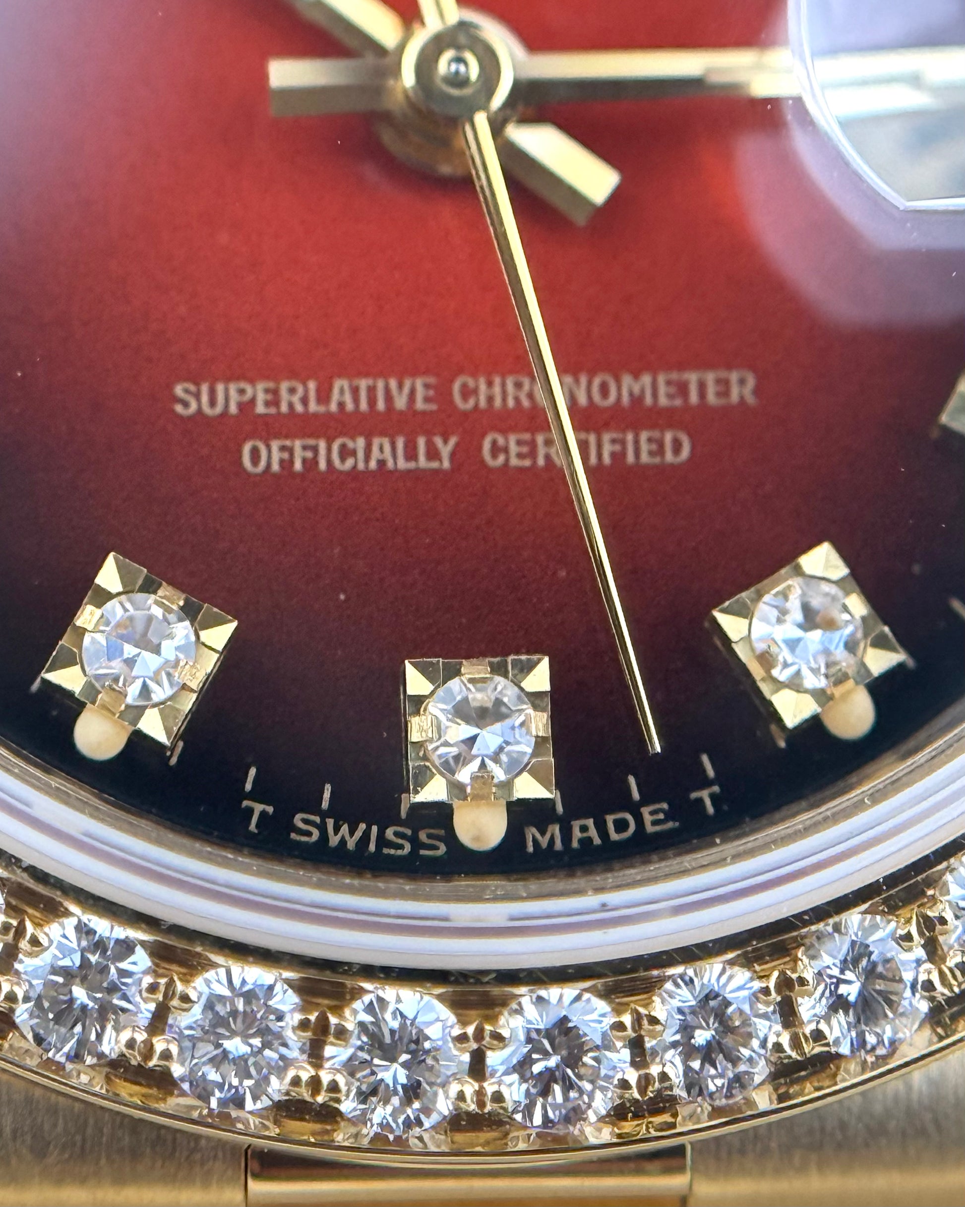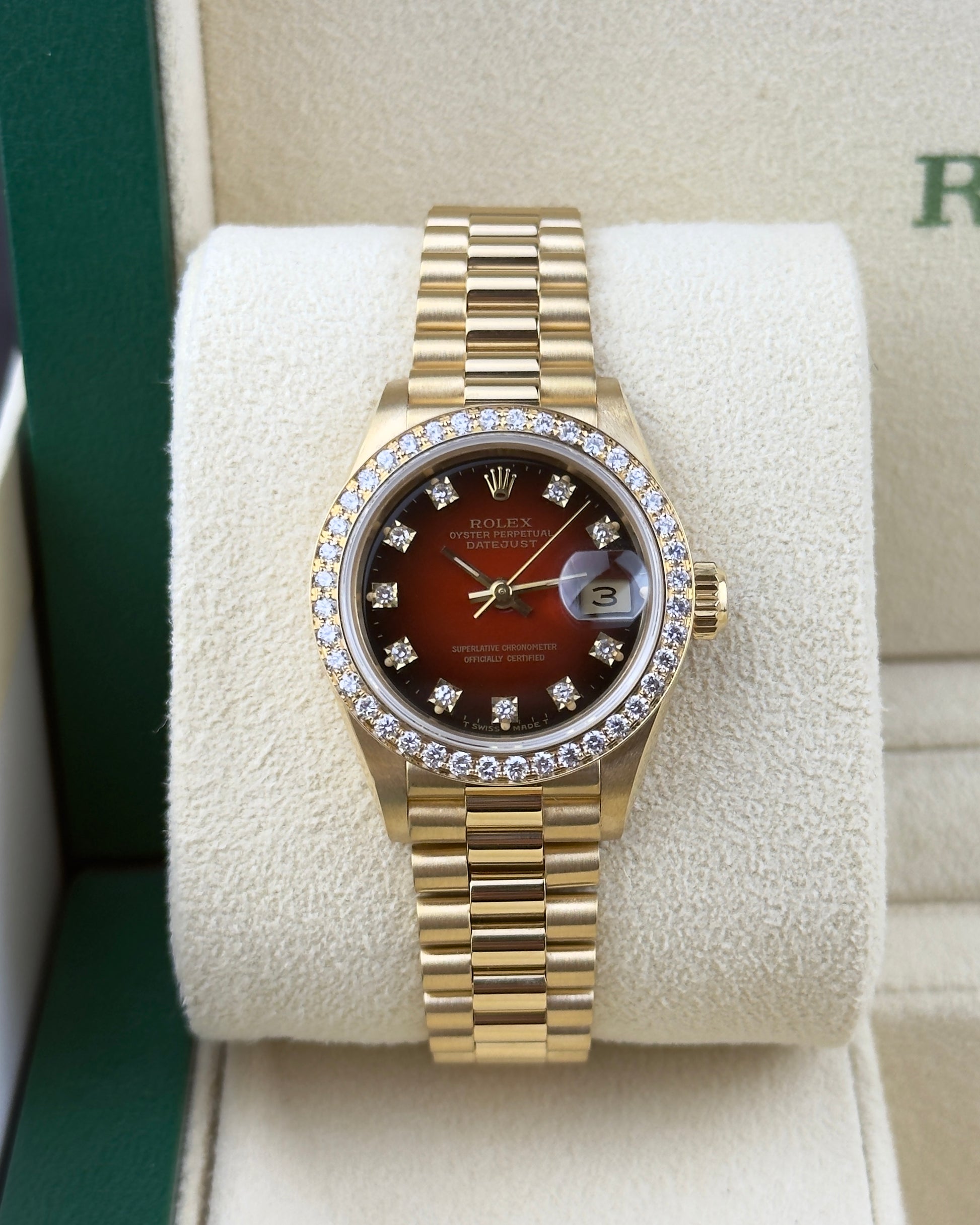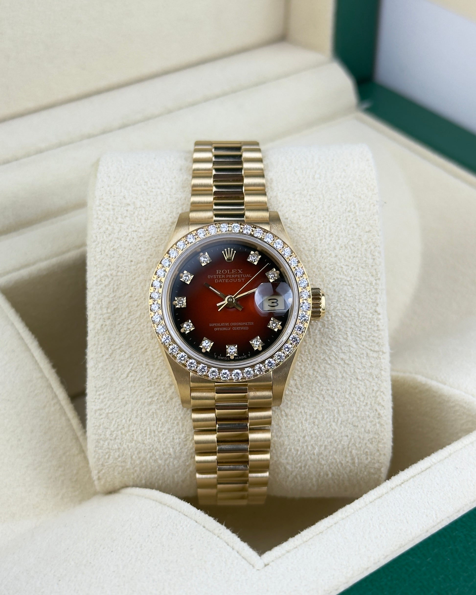 An exquisite expression of timeless sophistication, this Rolex Ladies President Model 69138 features an 18k yellow gold case accented by a factory diamond bezel, measuring a refined 26mm in diameter. Protected by a sapphire crystal, the striking Rolex factory red vignette dial is adorned with diamond hour markers, offering exceptional depth and brilliance. Powered by an automatic winding movement, the watch is paired with the iconic 18k yellow gold President bracelet featuring a concealed Crownclasp for a seamless finish. A true statement of elegance and prestige, this piece exemplifies Rolex’s legendary craftsmanship and enduring luxury.
