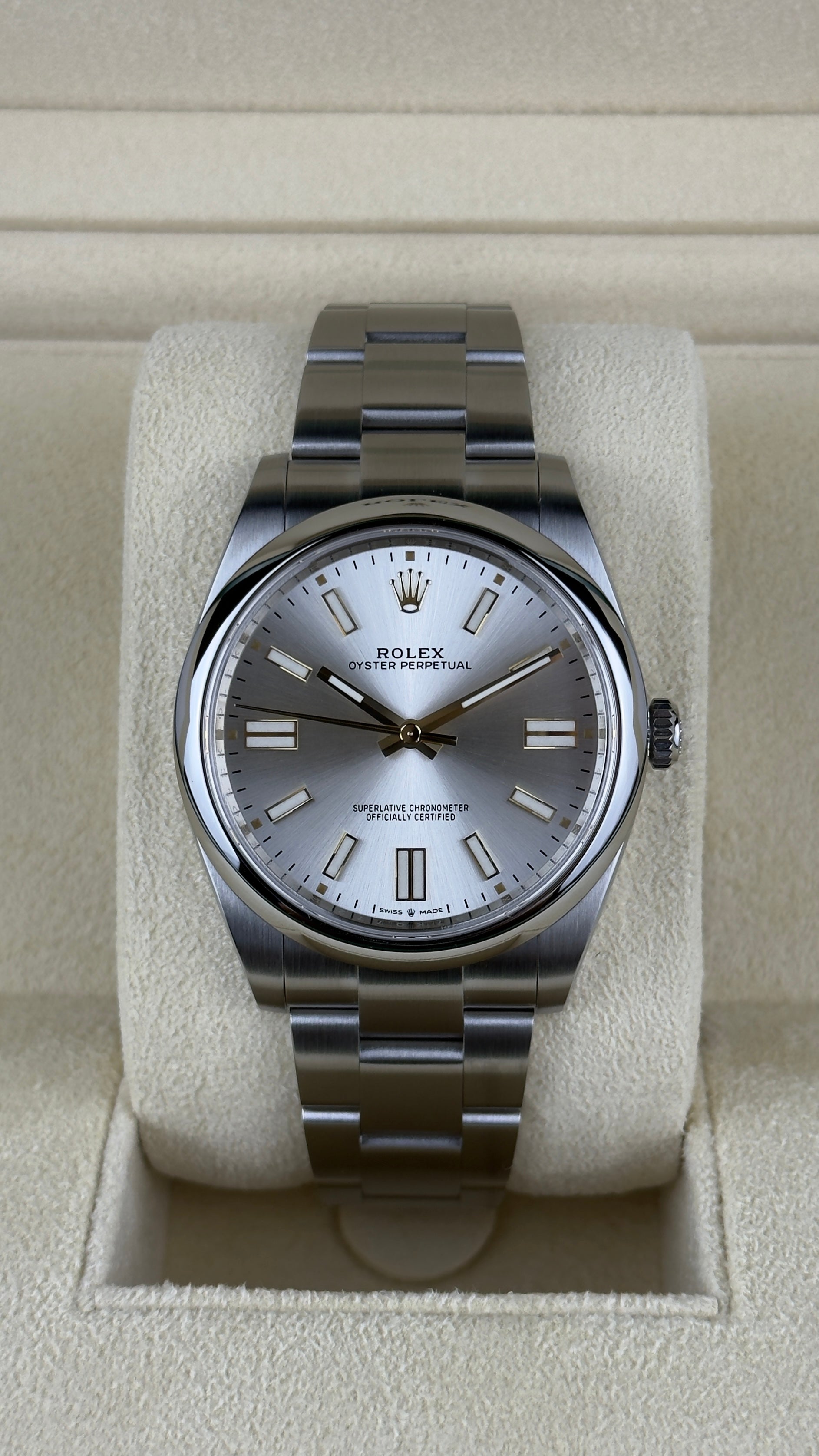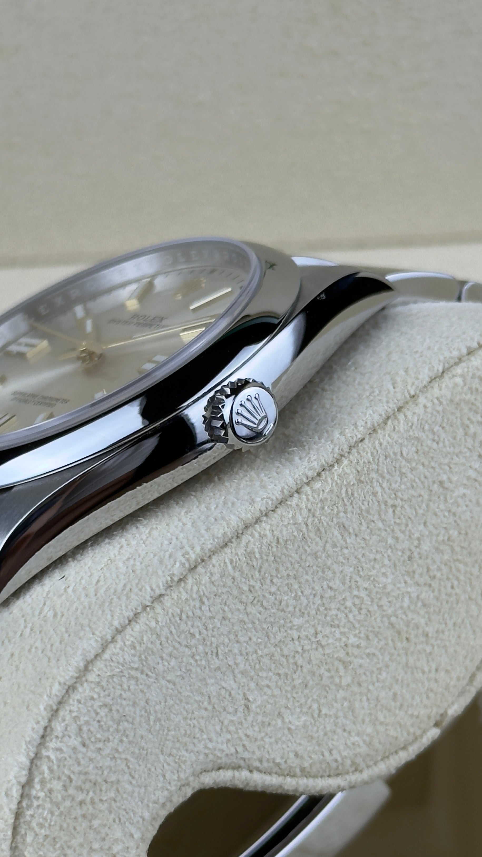 This Rolex timepiece features a robust 41mm Oystersteel case designed for durability and everyday elegance, paired with a screw-down crown equipped with the Twinlock double waterproofness system for enhanced protection. A smooth domed bezel frames the scratch-resistant sapphire crystal, revealing a clean silver dial with crisp index hour markers for excellent legibility. Powered by the Rolex Calibre 3230 automatic movement, it offers central hour, minute, and seconds hands, stop-seconds for precise time setting, and an impressive 70-hour power reserve. Completing the watch is the classic Oyster bracelet with flat three-piece links, secured by a folding Oysterclasp buckle and equipped with the Easylink 5mm comfort extension. With water resistance up to 100 meters, this watch embodies Rolex’s signature blend of precision, reliability, and timeless design.