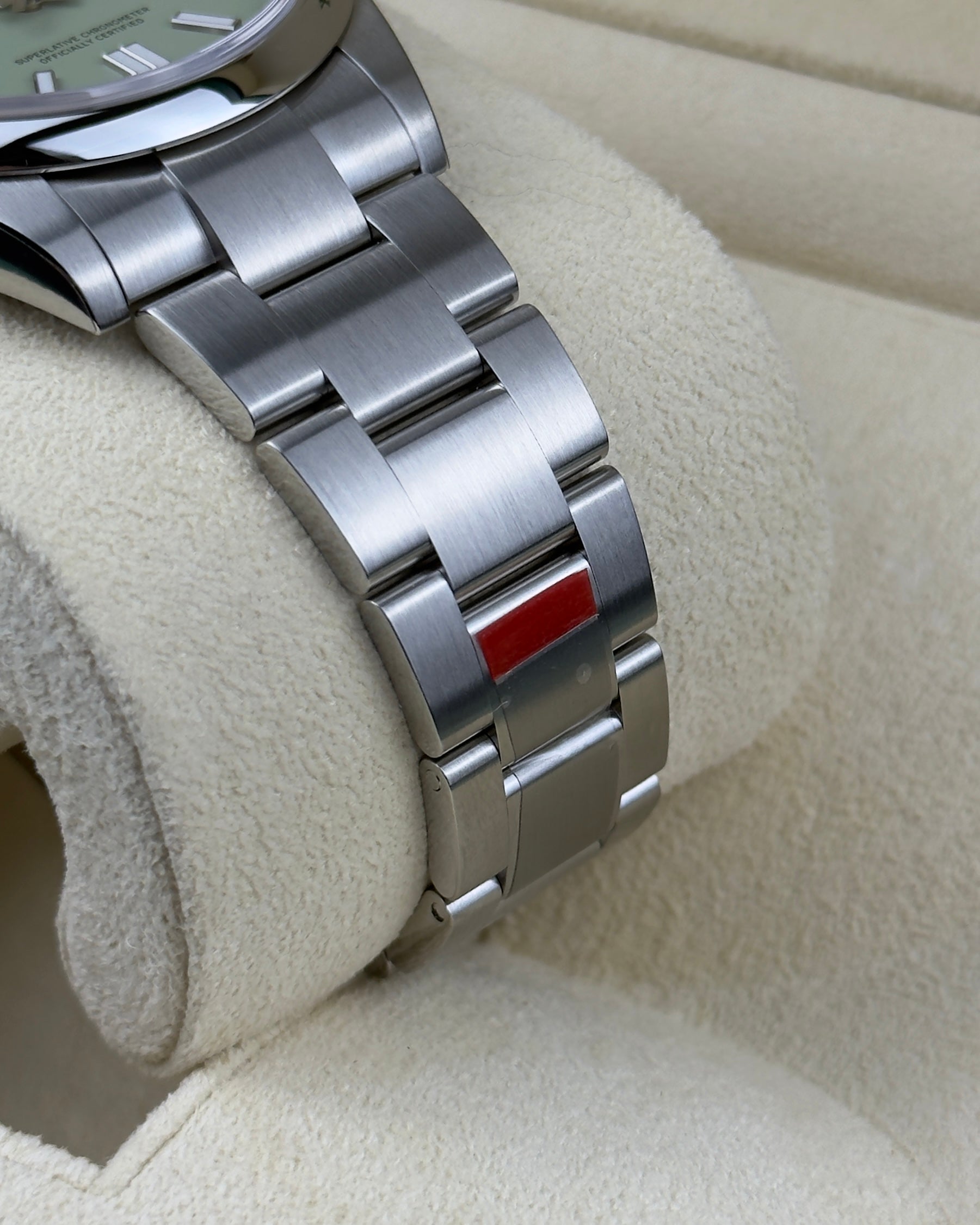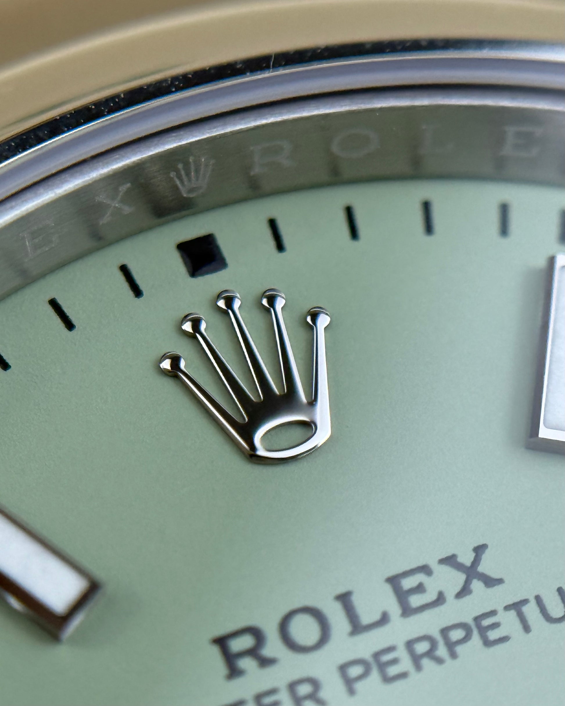 The The Rolex Oyster Perpetual 41 brings a fresh burst of colour to classic watchmaking with its striking pistachio green dial . Crafted from highly corrosion-resistant Oystersteel, the 41mm case is paired with the signature Oyster bracelet, delivering both comfort and durability. 70-hour power reserve, and Rolex’s patented Chronergy escapement for enhanced efficiency. Finished with a flat sapphire crystal and 100m water resistance, this 2025 release blends colour, performance, and everyday versatility in one refined package.