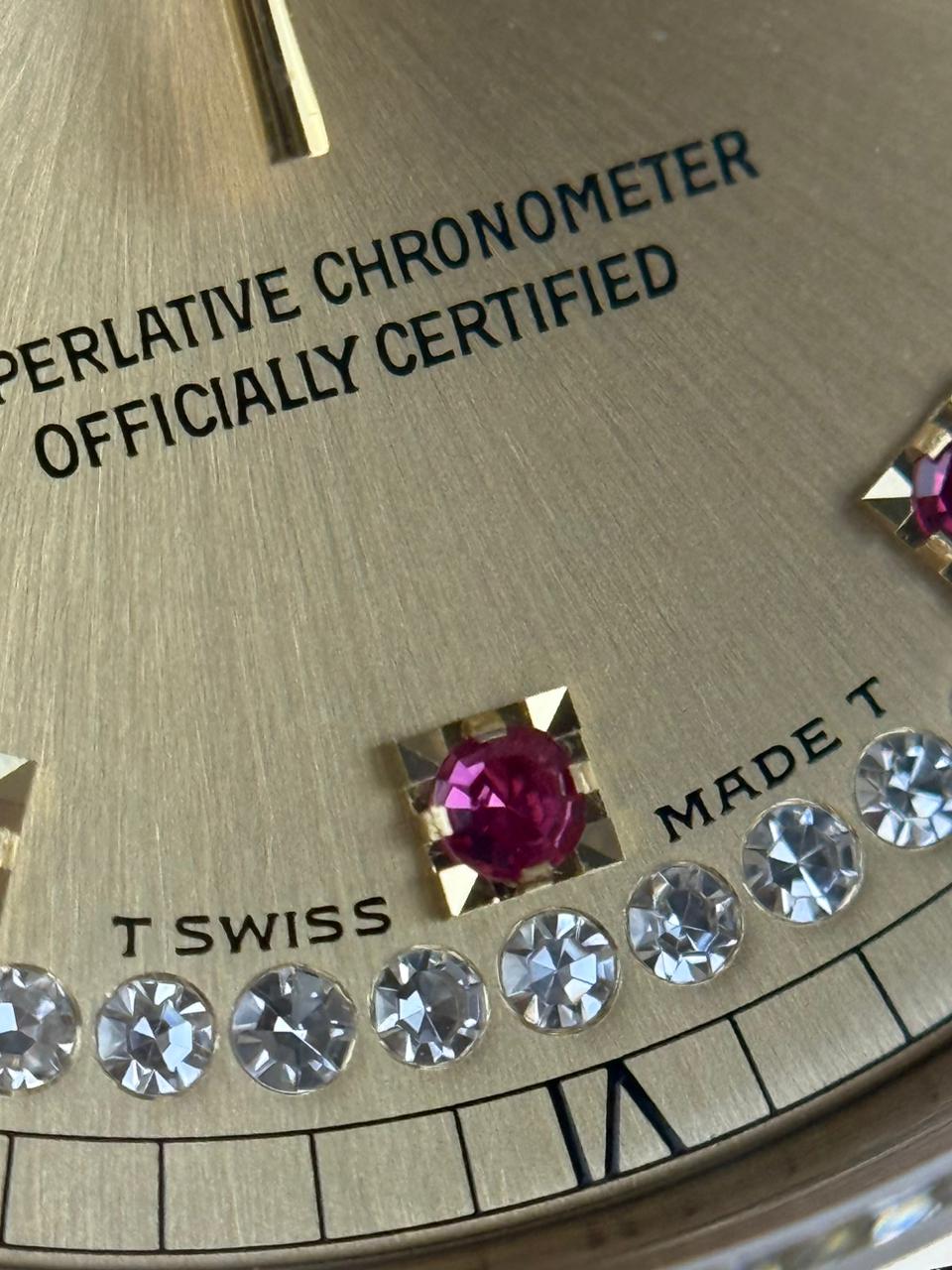 The watch is housed in a 36 mm 18k yellow gold Oyster case, crowned with the signature Rolex emblem and complemented by an 18k yellow gold fluted bezel. A scratch-resistant sapphire crystal with Cyclops magnifier protects the dial, ensuring clarity and durability. The original Rolex factory champagne string diamond dial is highlighted by ruby hour markers, creating a striking and highly elegant aesthetic. Classic Day-Date features include a sweeping center seconds hand, outer minute and half-second divisions, the day display at 12 o’clock, and the date aperture at 3 o’clock.