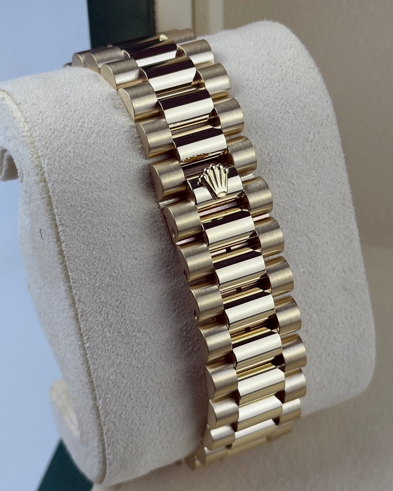 Completing the piece is the iconic 18k yellow gold President bracelet, offering exceptional comfort and a refined fit for wrists up to 7 3/4 inches. Timeless, opulent, and unmistakably Rolex, the Day-Date 18238 stands as a powerful symbol of status, craftsmanship, and enduring sophistication.
