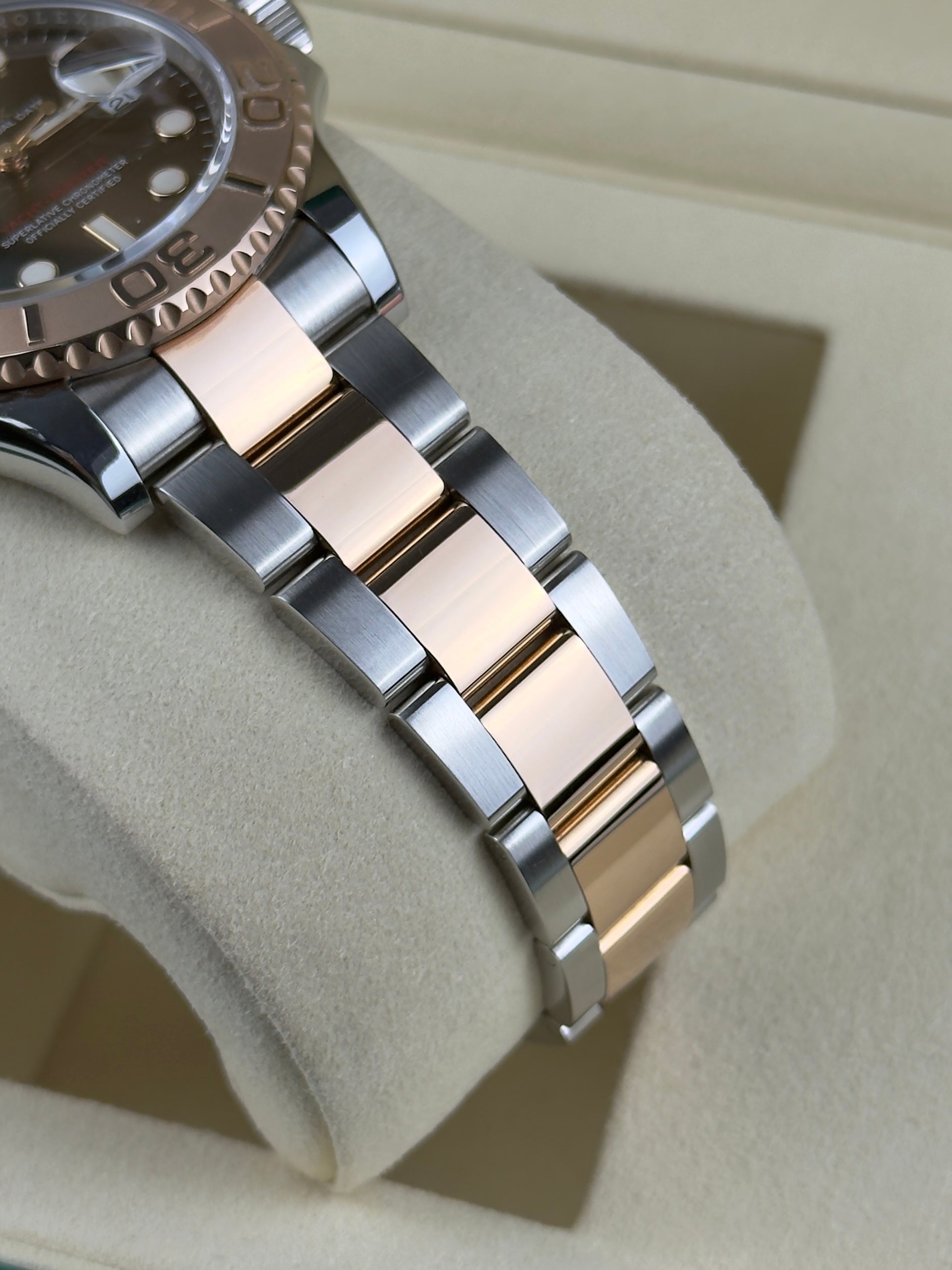 The Rolex Yacht-Master 40 mm in steel and Everose gold with a chocolate dial delivers a compelling blend of elegance and sport-focused design. The rich chocolate-toned dial adds warmth and depth, giving the watch a distinctive and refined character. Paired with a robust bracelet, it achieves a balanced aesthetic that transitions effortlessly between casual and formal settings.